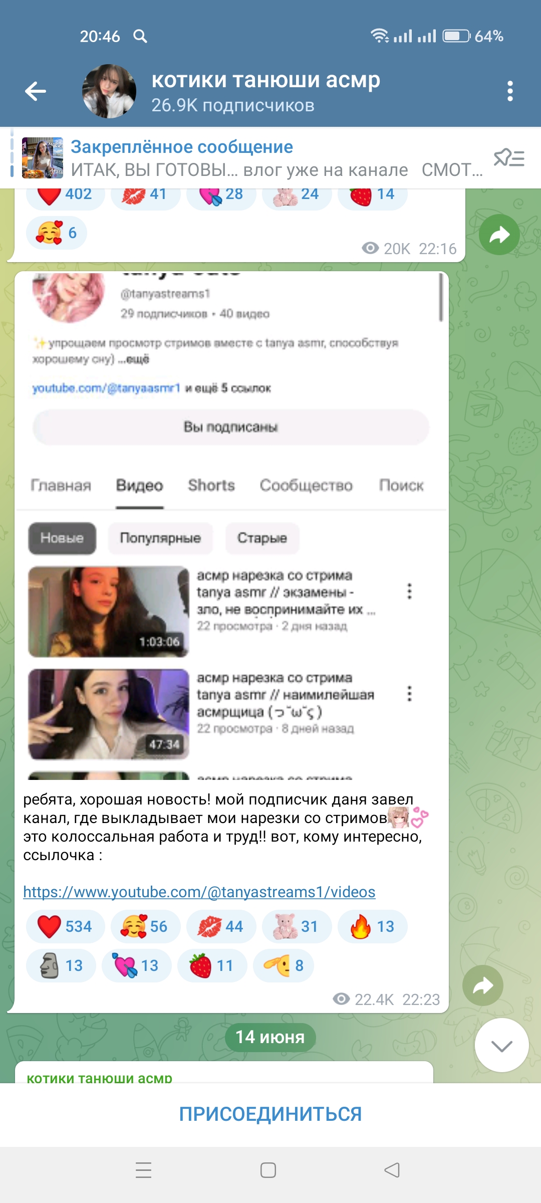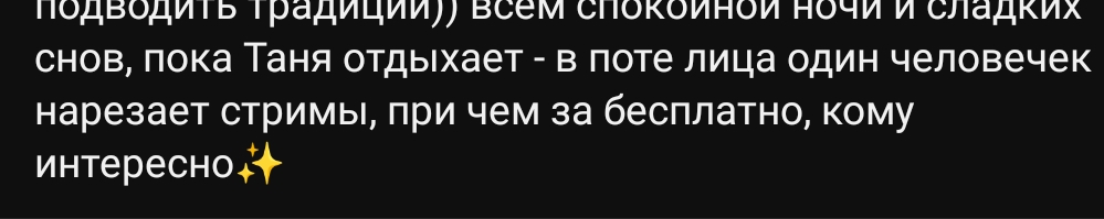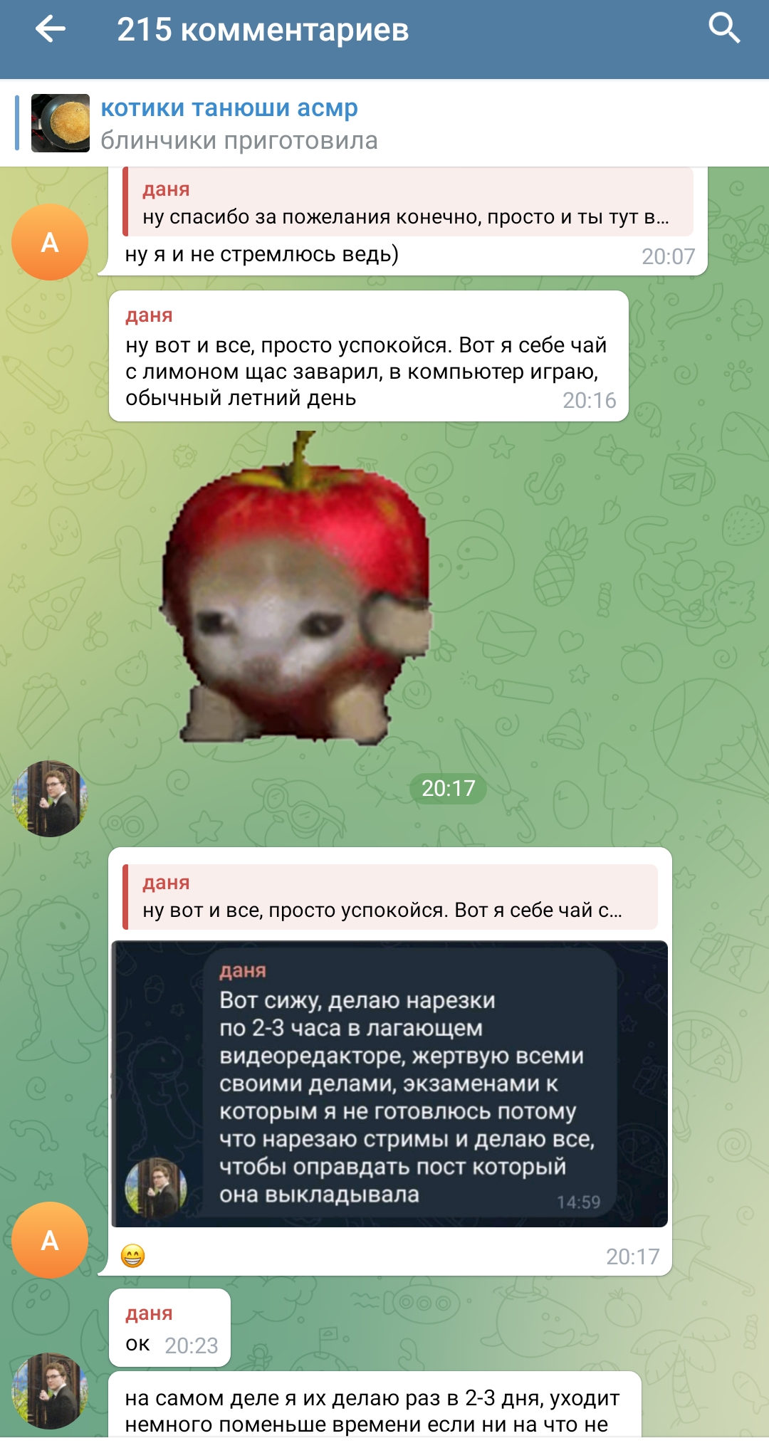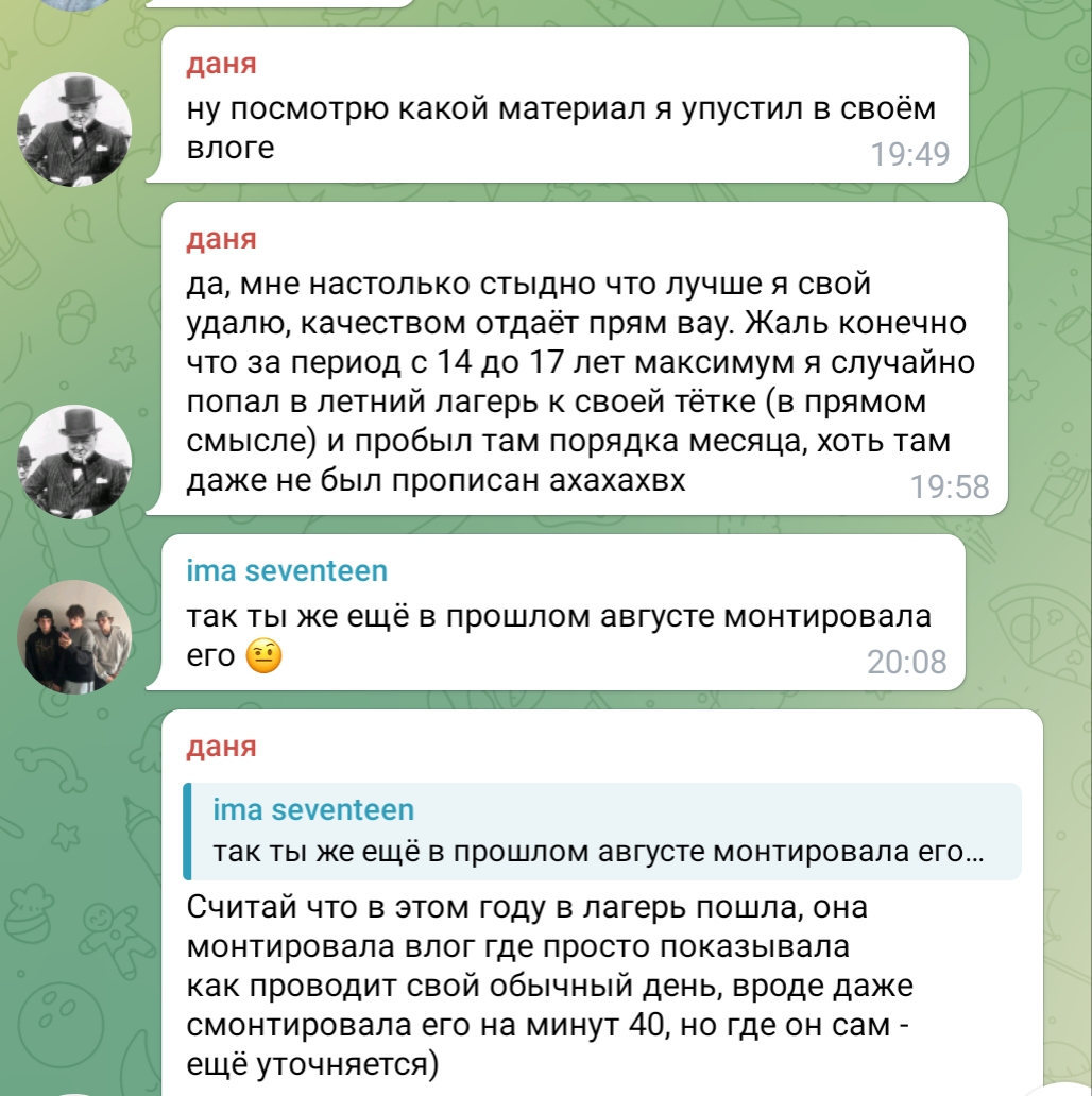 если кому интересно, то у неё абсолютное затишье, ни в телеграм канале ни дане ни в личке телеги ничего. наверное расстроена что не поступила куда хотела, а быть может активно готовится к переезду, ну или всё же занимается монтажом обещанного какого-то видео которое если ей оно не понравится то не выложит. ещё про егэ вроде обещала видос, но видимо там влог, а блогерша из Тани никудышная пока что, она больше стримерша и создатель контента сюжетного.