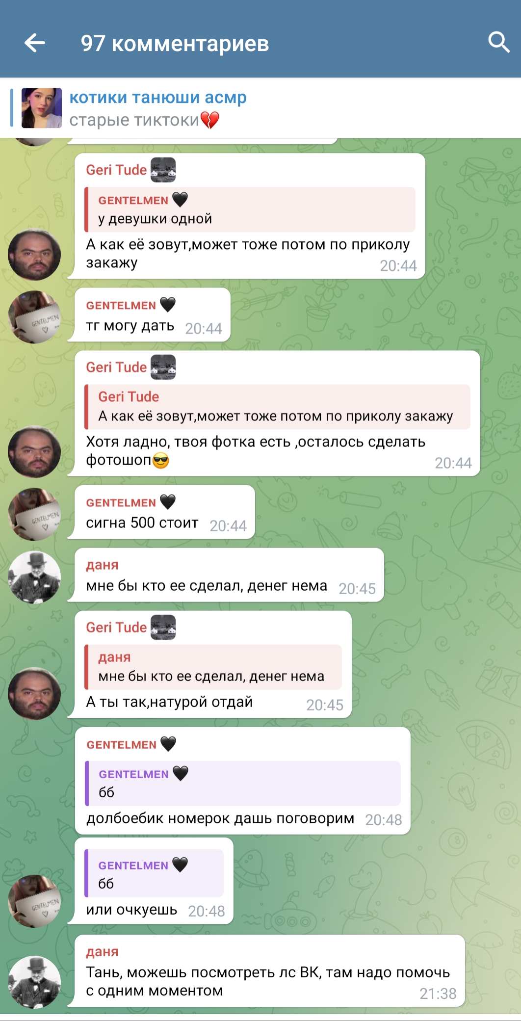 P.s Таня если ты это читаешь, пошла нахуй, лечись блядь, потому что делать о себе тред и сливать СВОю инфу, это, блядь, пилотаж высшего уровня.