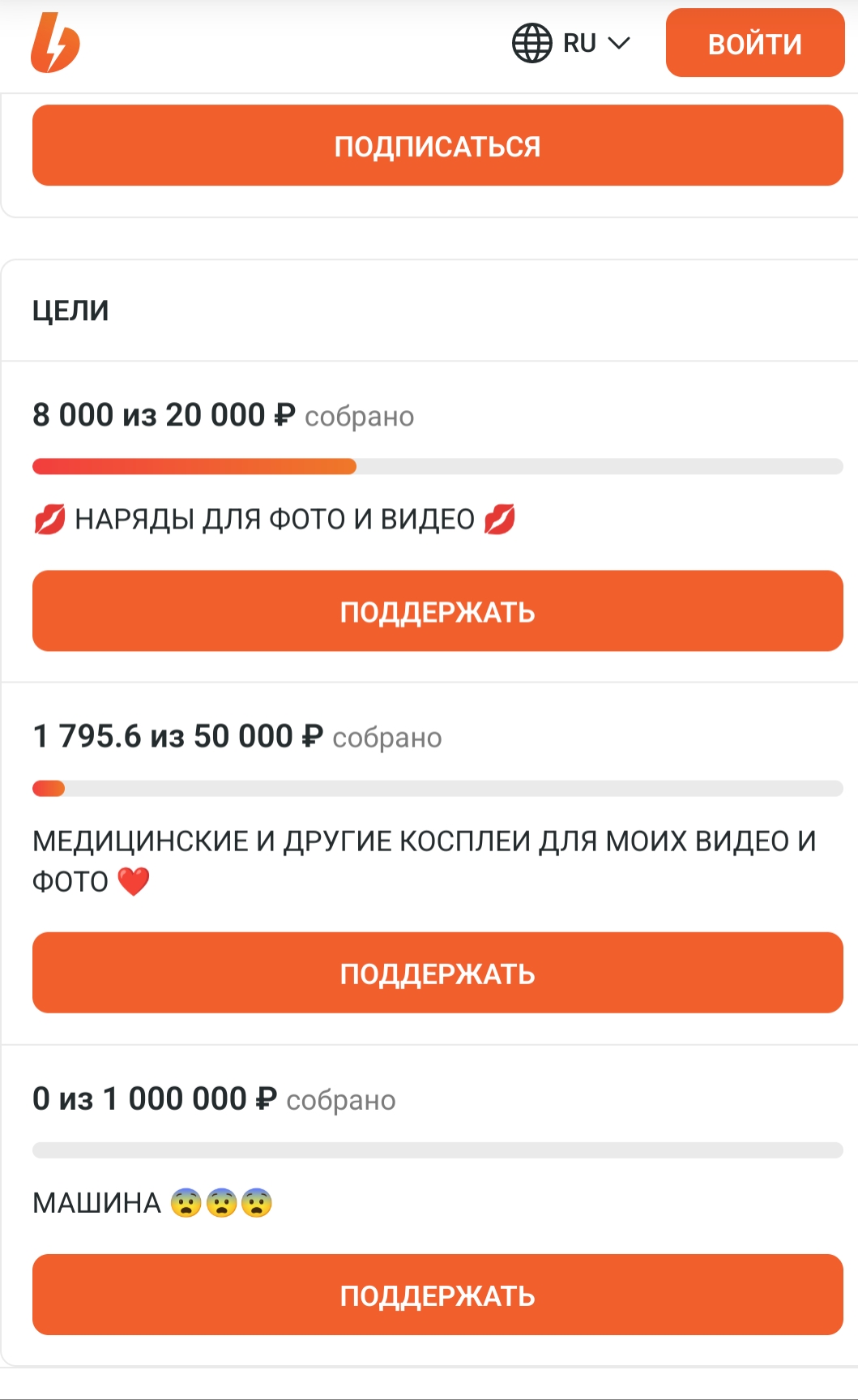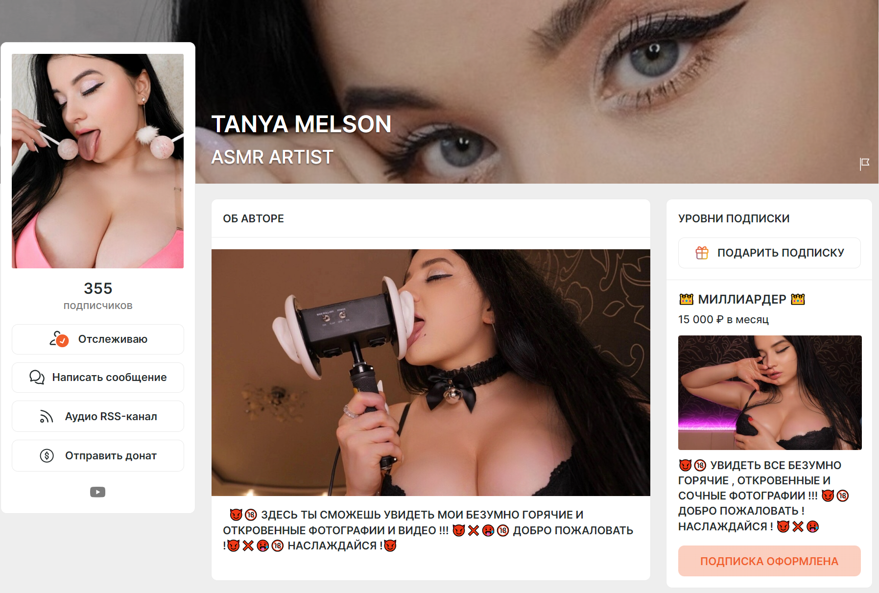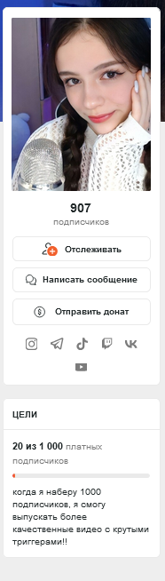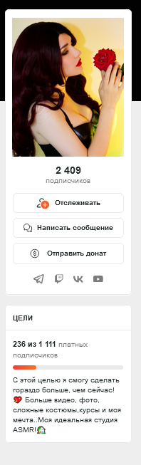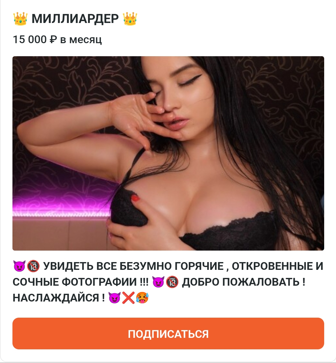 а так поставила бы вменяемые цены: 1 000 фотки без ню (фотки по 5-10 штук в неделю) 2 000 видео без ню (ASMR видео 2 в месяц) 5 000 фото + видео с ню (18+ фото 5-10 в неделю и 18+ видео 2 в месяц) 10 000-15 000 можно добавить 1 видео на заказ в месяц +1 приватный стрим для обладателей этой подписки на часик, где можно поставить голы при сборе определённой суммы на топлесс или полностью раздеться, при этом она общается, выполняет триггеры, можно добавить колесо за донат