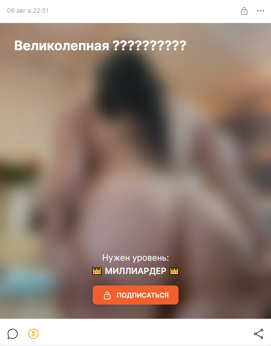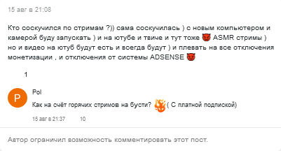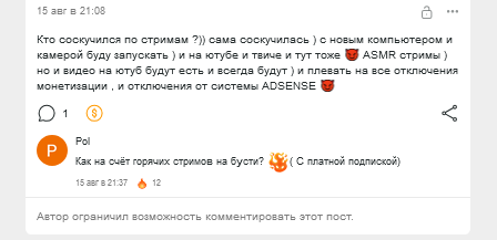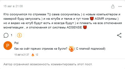 вот пример с КК, сейчас у неё наверно самая низкая подписочная база из-за проёбов по видео в течении месяца и скучных видео в июле и всё равно это 200+ платников, для сравнения в прошлом году в сентябре у неё было 300+ платников, то есть её доход с бусти в среднем 300 000-500 000 рублей в месяц с учётом донатов под постами и в личке даже при таком наверно самом плохом месяце в году, когда она реально обленилась максимально