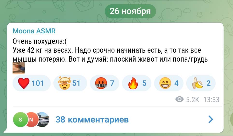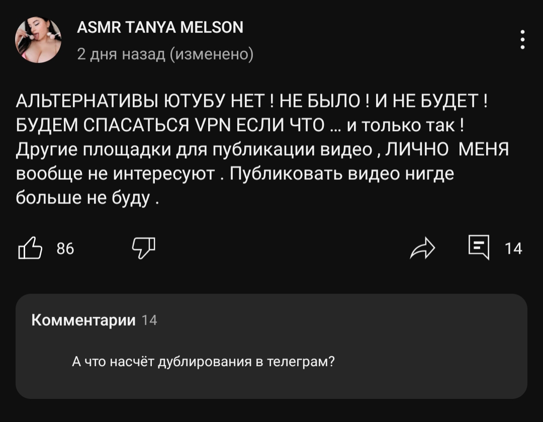 0очу отметить, что нейро контент весь этот, всего лишь продолжение её же стиля постов на бусти, а также на монтаже видосов, она знает что корчит смешные выражения лица, что здесь в скринах и запощено, она баба (уже баба) с юмором, стоит лишь зайти на бусти и прочитать её заголовки там, также и комментарии на ютубе она пишет всегда с юмором, так что мы её никак и не оскорбляем по сути, а продолжаем её идеологию бля.