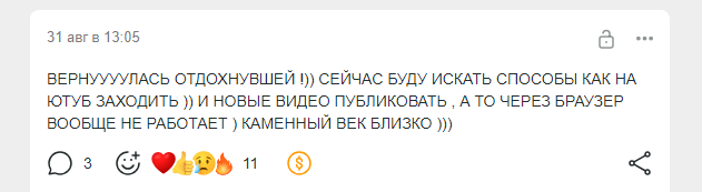 Да значит это уже 9ое возвращение. Как обычно 2 месяца контента актива и несколько месяцев тишина гробовая. Уже сбился со счета как часто она так делает. Ну надеюсь она сделала выводы что надо людям чтобы бусти покупали хотя бы. И что-то сделает с забаненным акком VK и поймёт что первый аккаунт boosty у неё угнал какой-то долбоёб местный шиз.