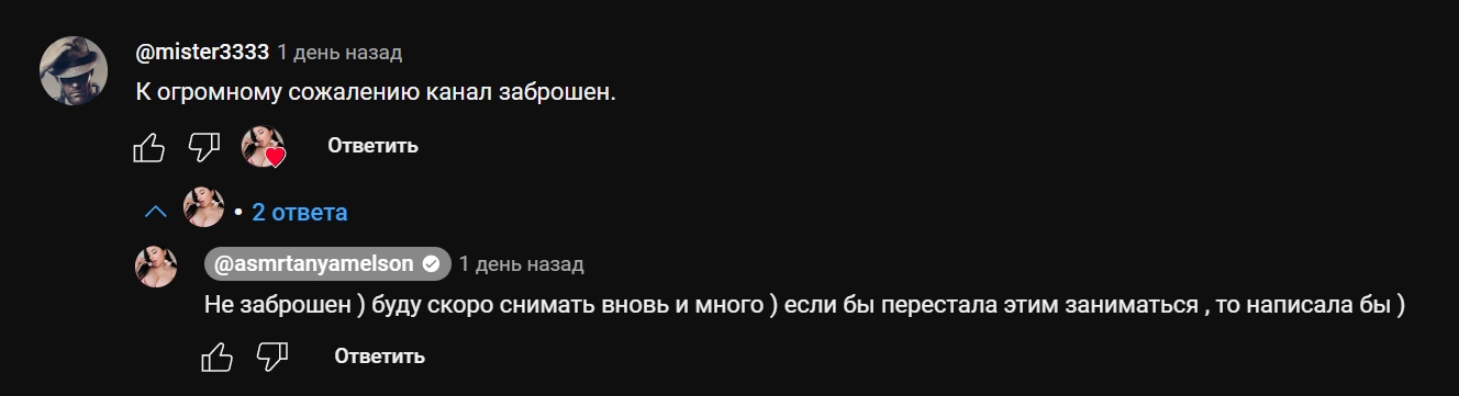 танюха по идее опять должна появится перед новым годом и на ютубе со своим 100 по счету видио осмотр у врача и со стримами и должна начать выкладывать одинаковые фотки у себя на бусти какой смысл покупать одинаковые фотки на бусти не чего нового она не выложит точно так же как тысячные видио осмотр у врача таня очень предсказуема она чя вернется на месяц а потом опять уйдет в спячку на несколько месяцев.