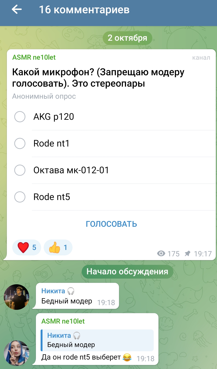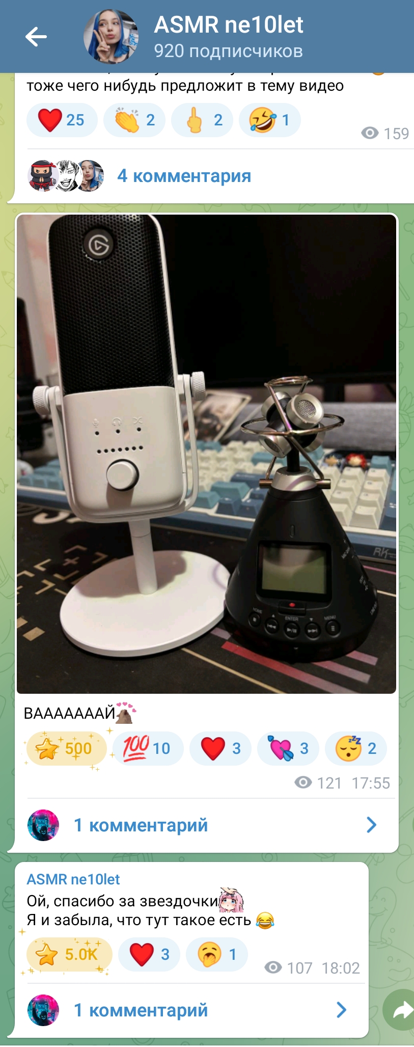 нахуя ей микрофон за сотку, если она может за копейки заказать пару динамических микрофонов, силиконовые уши на алике и сделать себе 3дио, чтобы облизывать своим инцелам ушки?) она по-твоему в центре нью-йорка живет, чтобы тратить сотку деревянных на всякий кал?)