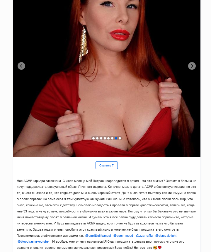 короче если бы не ютуб / открытие ею жанра асмр и стечение обстоятельств какихто, ну скорее всего её уволили с работы или чтото такое, то она бы пошла в порнографию бы. раздеться - не составляло ей труда никакого уже в самом начале карьеры асмр. просто раньше это делалось с её личным интересом, а сейчас просто за деньги.