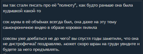 я уверен, что именно эта тварь довела нашу Муну до такого состояния, понятно что Муне всегда было непросто в эмоциональном плане, но всегда есть триггер после которого происходит провал и мне кажется что именно эта хуета и спровоцировала этот приступ боли и негативных мыслей
