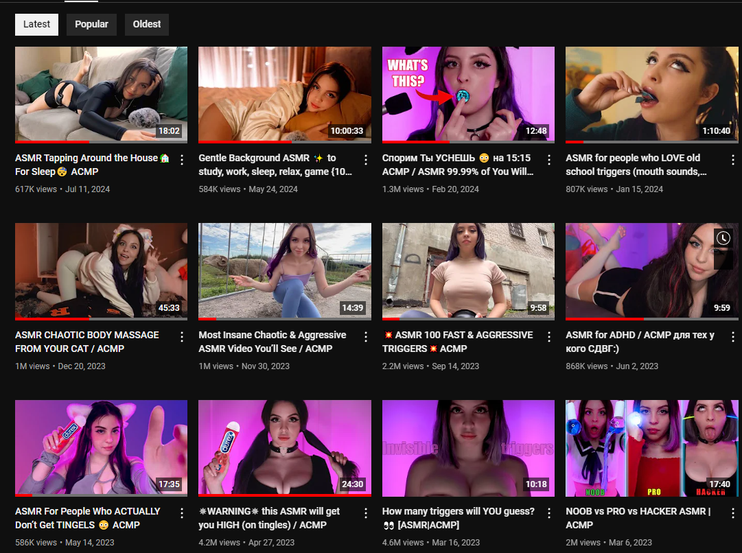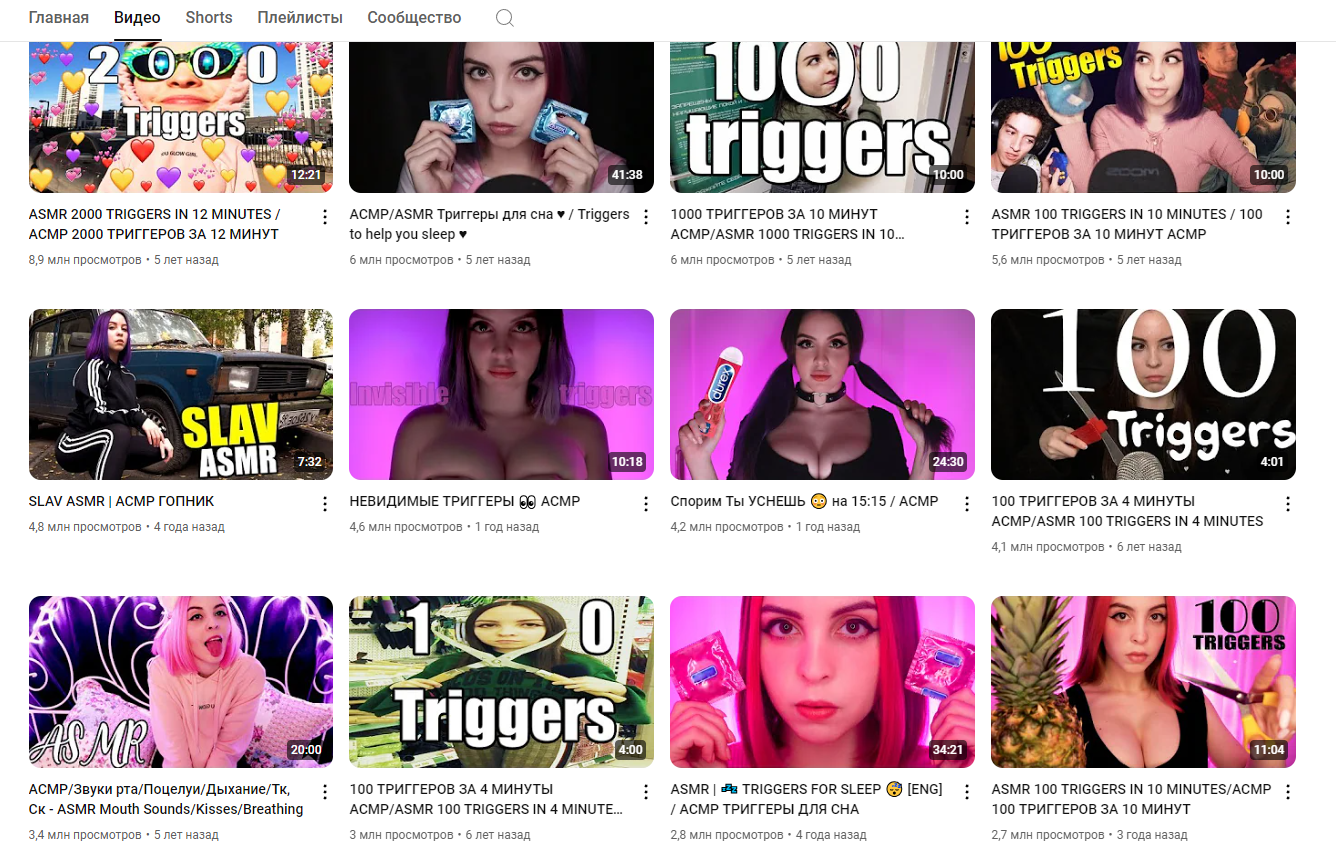 >>178313 Ну давай посмотрим, отфильтруя по просмотрам - а что тут у нас? А ой видосы как раз тогда 5 лет назад когда она была заинтересована в норм контенте, когда старалась, ни у кого из асмрщиц не было припизднутого контента про шизотригеры. А теперь жалкие просмотры и оголенка на бусти. Вот он успех шлюхи.
