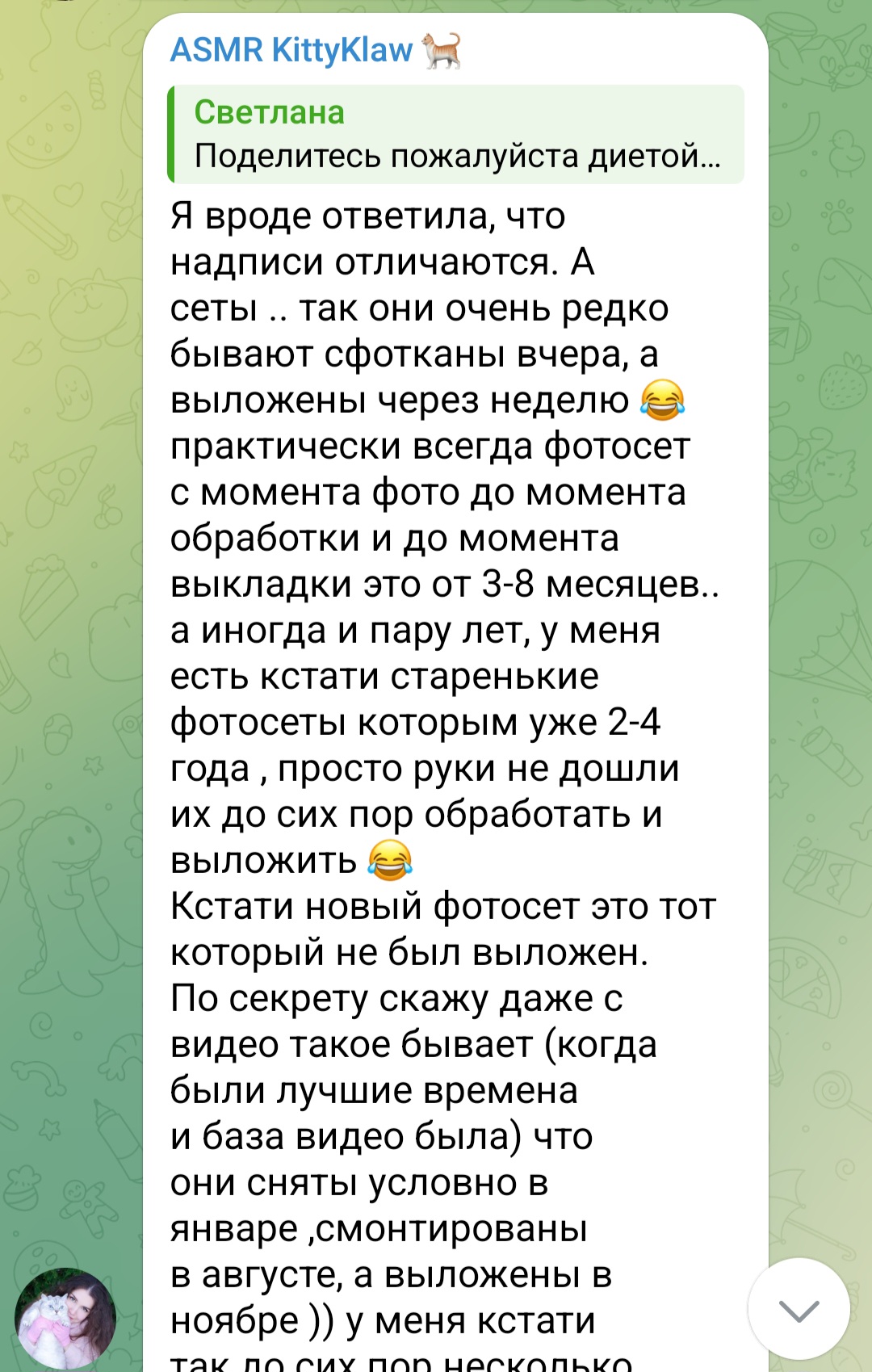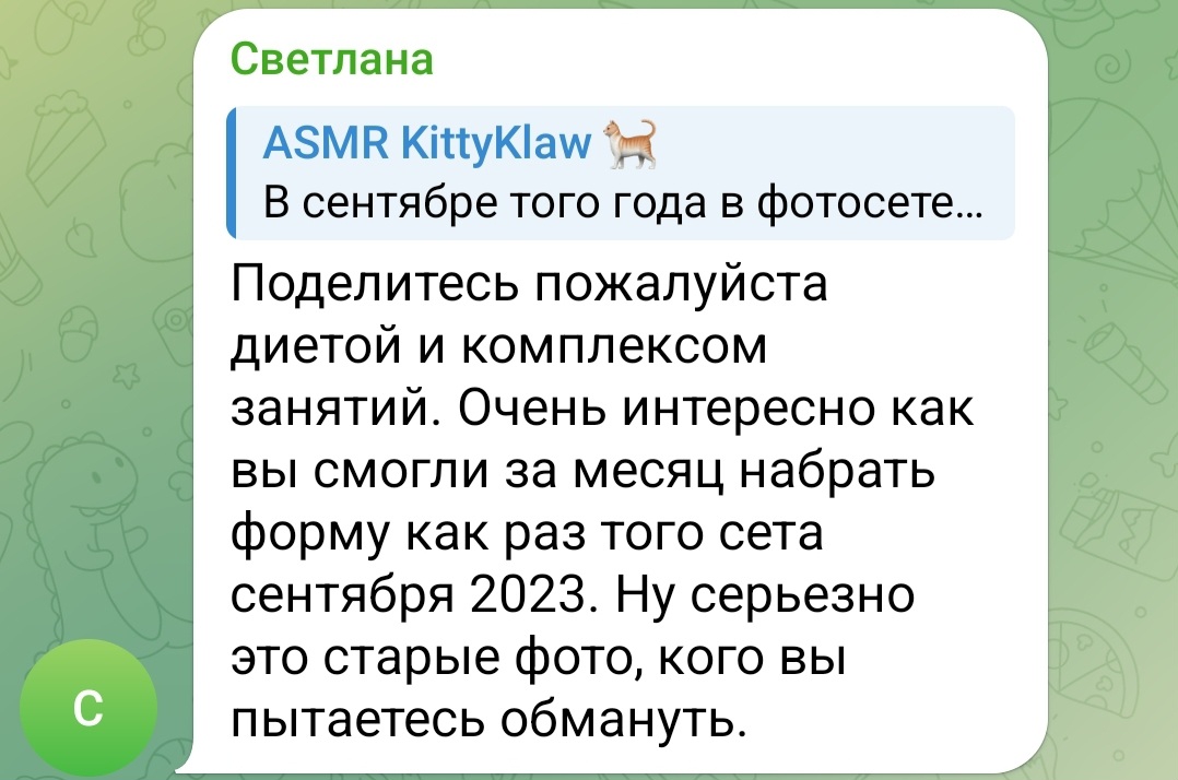 Светлана в комментах тг с вопросом о диете - это конечно сильный заход. Там после первого предложения видны уши двачера, азаза. Признавайтесь, кто тут Светлана ?