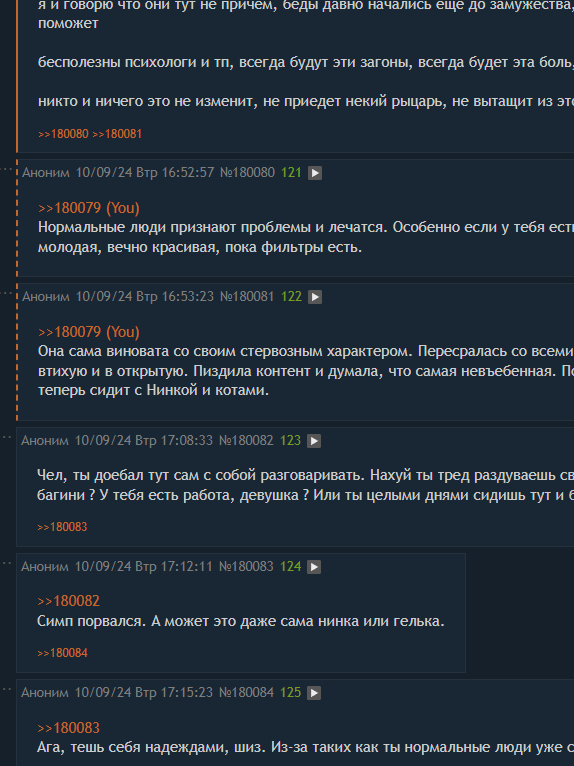 >>180043 >думаю что она тред читала, тут кто-то точно писал что она жирная переодически Они все зарабатывают минимум лям в месяц, это просто минимум. И это не пиздеж. Когда ещё была жива восьмерка, там сливали цифры из-за уязвимости патрика. Так вот, каждая зарабатывала минимум лям или полтора. Так вот, ты реально думаешь, что им важно, что о них пишут? Даже не пресса, а на каком-то форуме, где высраться может просто любой рандомный долбаеб? Они заработали бабла себе уже на всю жизнь, им глубоко поебать на двач и местных шизов. Они уже давно не дорожат вашими подписками и жалкими 1500 в месяц. Поэтому гельке уже давно срать на критику. Тупо всех блокирует и все. И ты думаешь, она специально полезет почитать какие-то высеры о ней? Чтобы потом резко худеть, потому что какой-то долбаеб что-то о ней написал? Смешно.