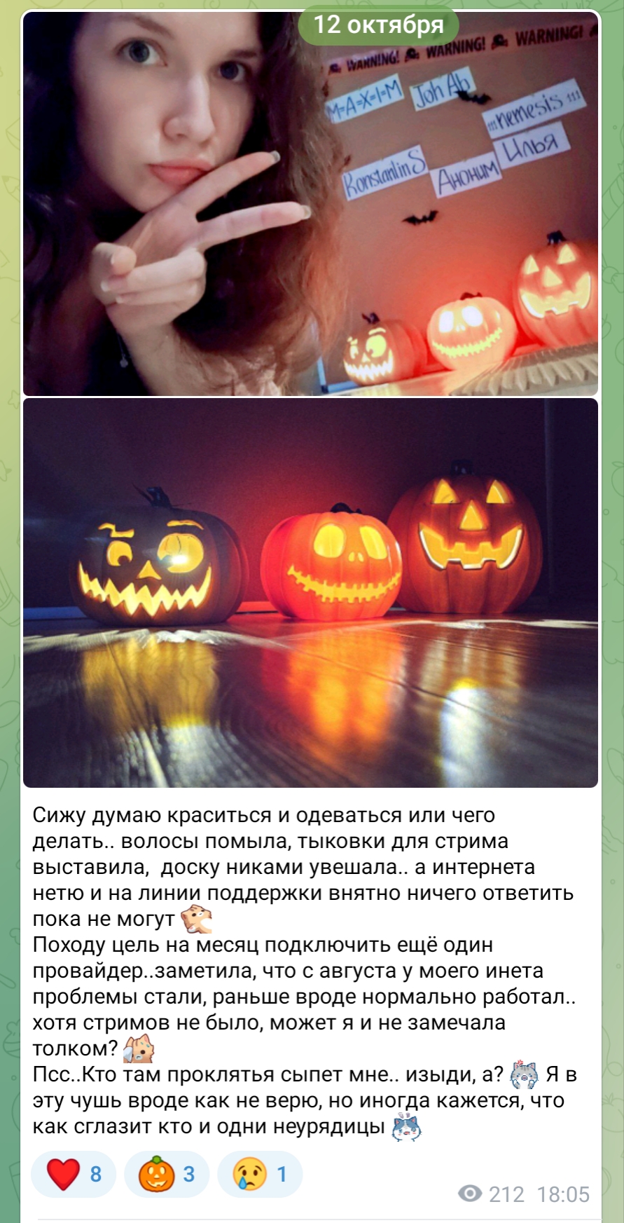>>180079 Она сама виновата со своим стервозным характером. Пересралась со всеми, начиная от родителей заканчивая блогерами, устраивала травли втихую и в открытую. Пиздила контент и думала, что самая невъебенная. Постоянно врала подписоте. Итоге видимо доканала еще и мужа и теперь сидит с Нинкой и котами.
