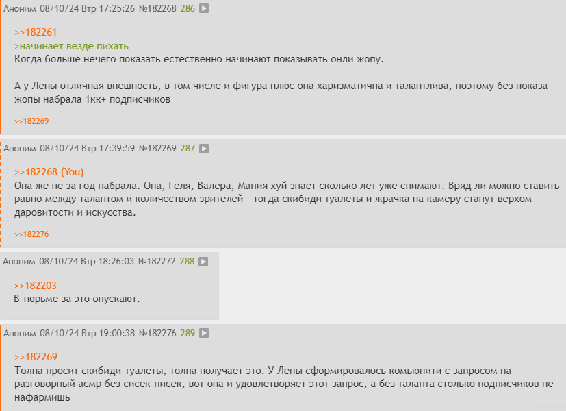 >>182269 Толпа просит скибиди-туалеты, толпа получает это. У Лены сформировалось комьюнити с запросом на разговорный асмр без сисек-писек, вот она и удовлетворяет этот запрос, а без таланта столько подписчиков не нафармишь