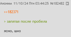 >>182928 >Я хз с кем ты переписываешься С твоим молодым человеком, наверное. > Я написал два последних поста неделю назад. Так что можешь сбавить тряску Мне похуй, когда и что ты писал. Аноны ничем не отличаются друг от друга.