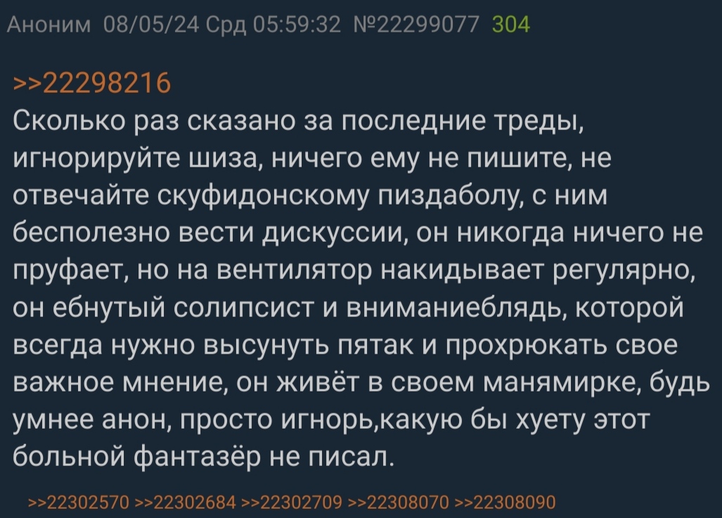 >>182957 >Чел ты дваче, ты на серьёзных щах за шизу предъявляешь? Да. Вопросы? >Ты типа такой пришел в автомастерскую и неиронично возмущаешься тем, что там чинят машины. Пример больше подходит к твоему другу, который возмущается, что его перепутали с другим аноном. При том, что такое на дваче происходит постоянно, ведь тут нет никаких индивидуальных маркеровок и ников. >мимо точно не шиз Ты точно шиз и твой дружок долбаёб такой же. >>182959 >Спросить видимо, я это или нет, тебе не вариант, мозгов не хватает похоже. А на хуй пойти не хочешь? Кто ты такой, чтобы я тебя об этом спрашивал? Если это не ты, значит просто промолчи. В чём проблема промолчать, шизойд? Анон, которому посвящено сообщения прочтёт и отреагирует, если захочет. Вот и всё.