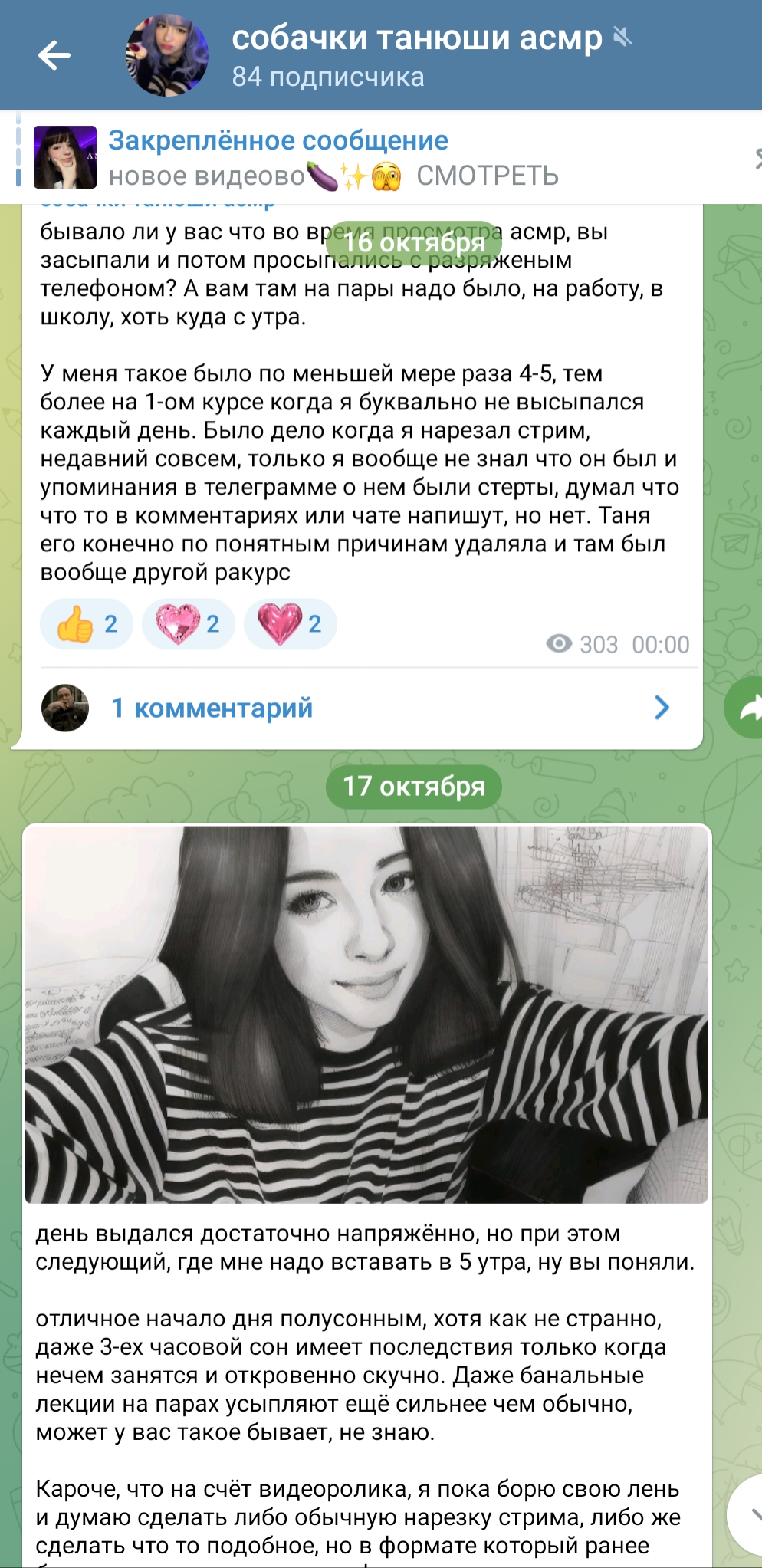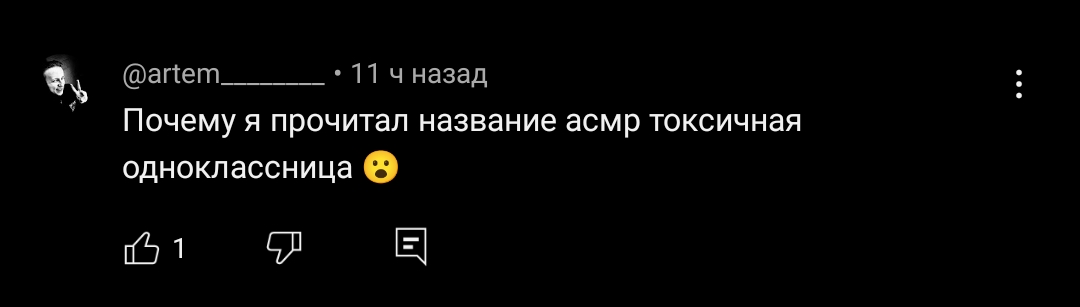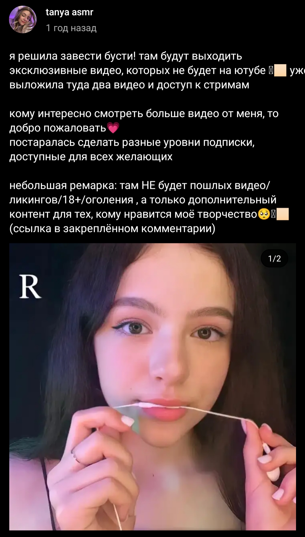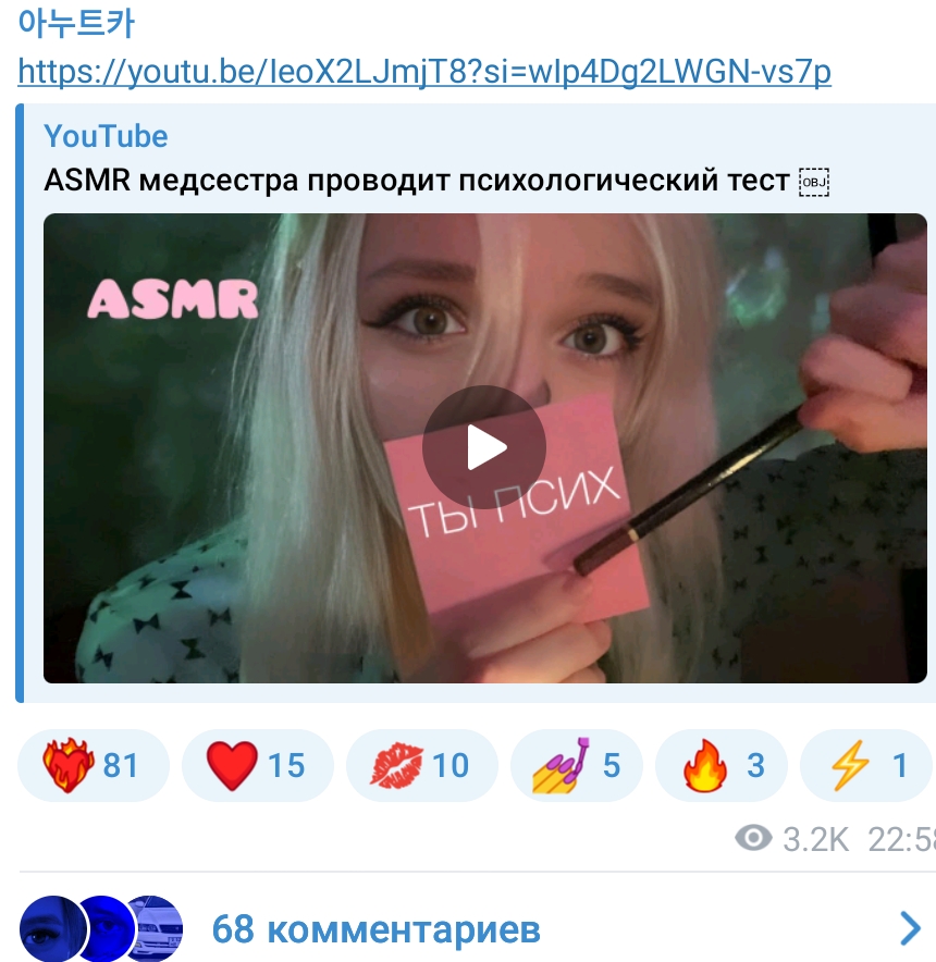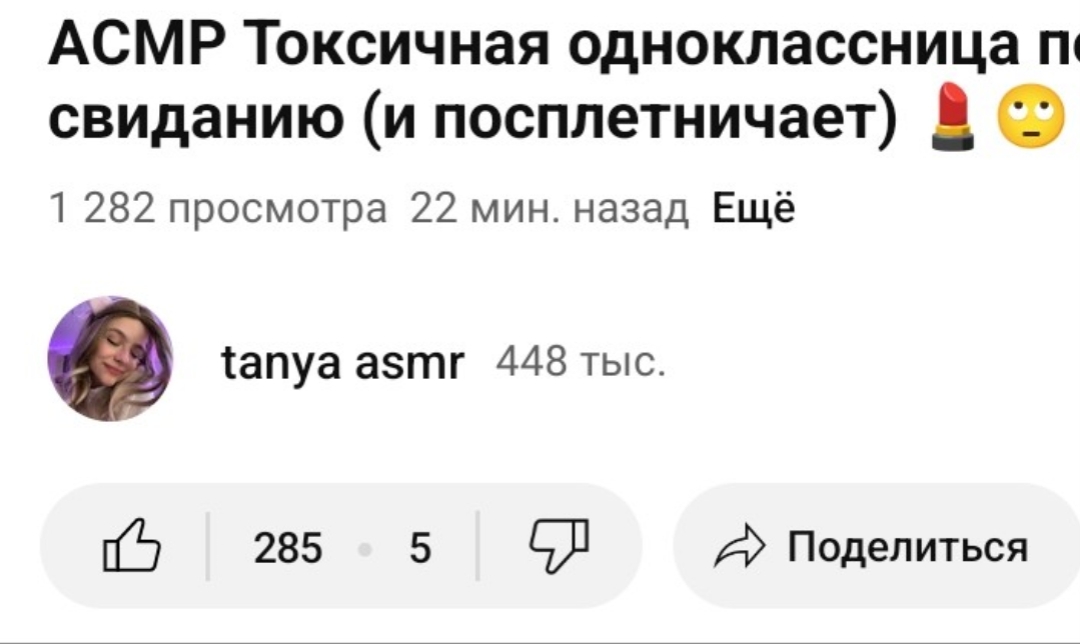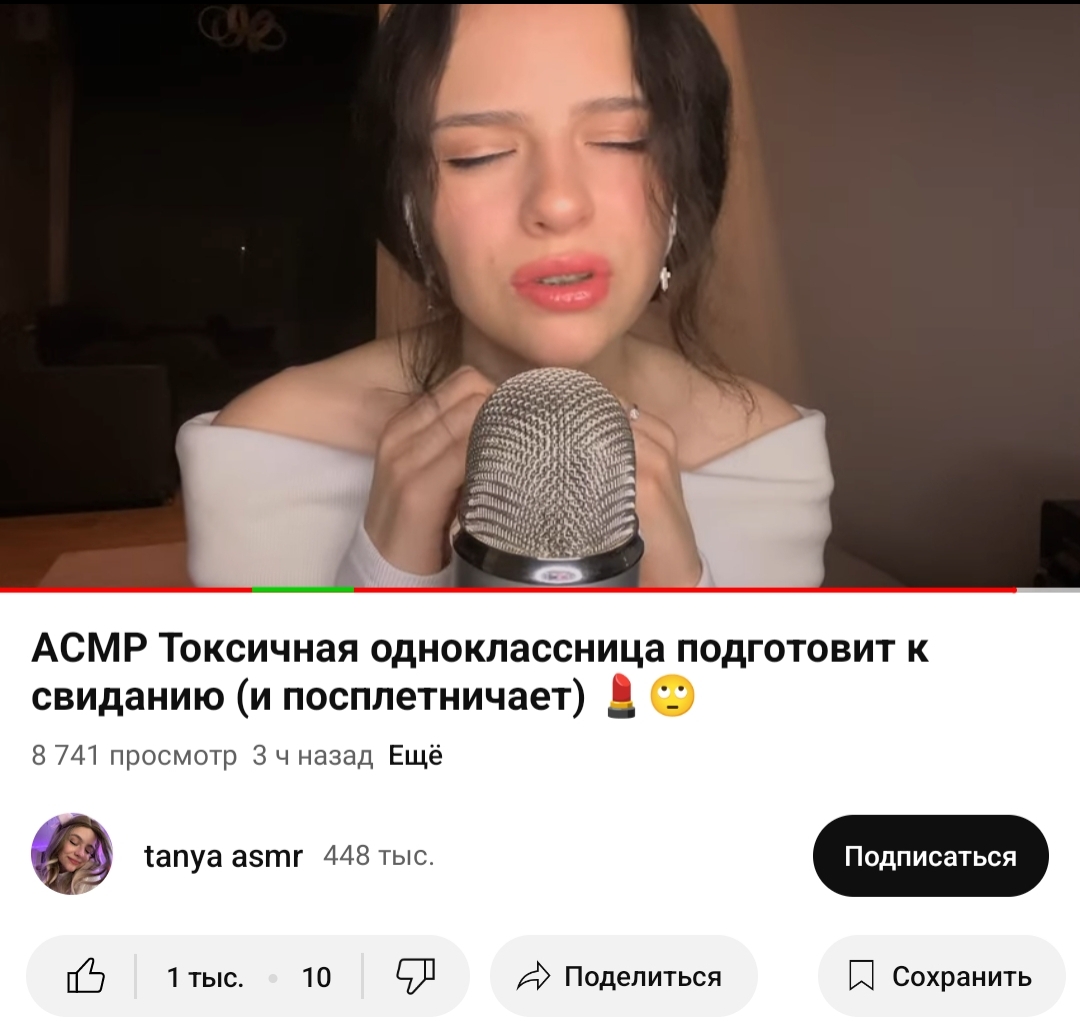 а вообще както слабо вяжется её скромность со всем этим асмр, если она сама заявляет что психически неуровновешанная по сути в жизни, но когда пишет кружки я хотя бы понимаю что она говорит, когда шепот еёный , я половину ниуя не понимаю, и дело не в шепоте а в том что на проглатывает слова. ну а такая банальная ошибка в словах от волнения сильного / стресса а также что русский скоро изза мгимо станет не её основным языком, у неё в голове уже больше английских слов .