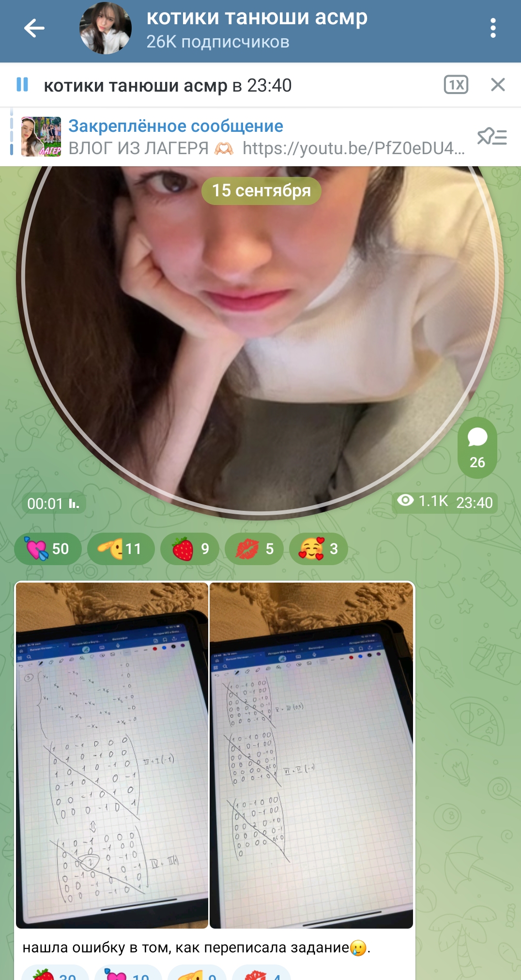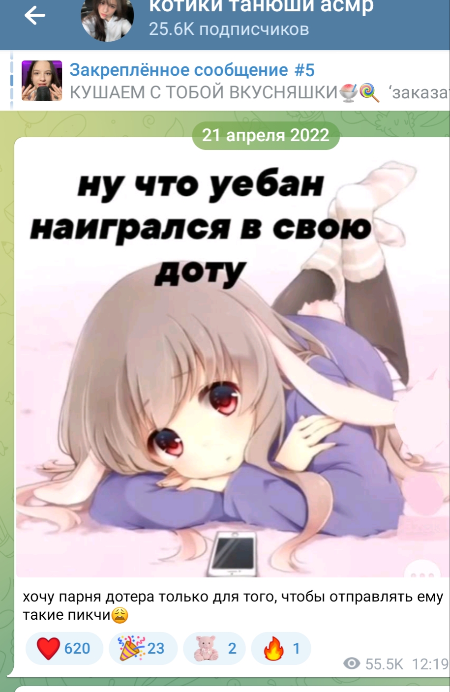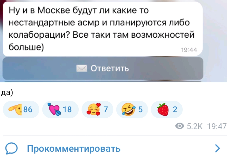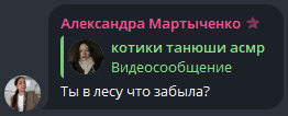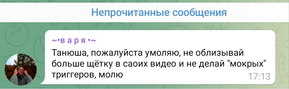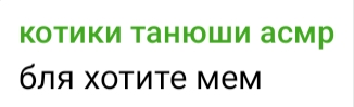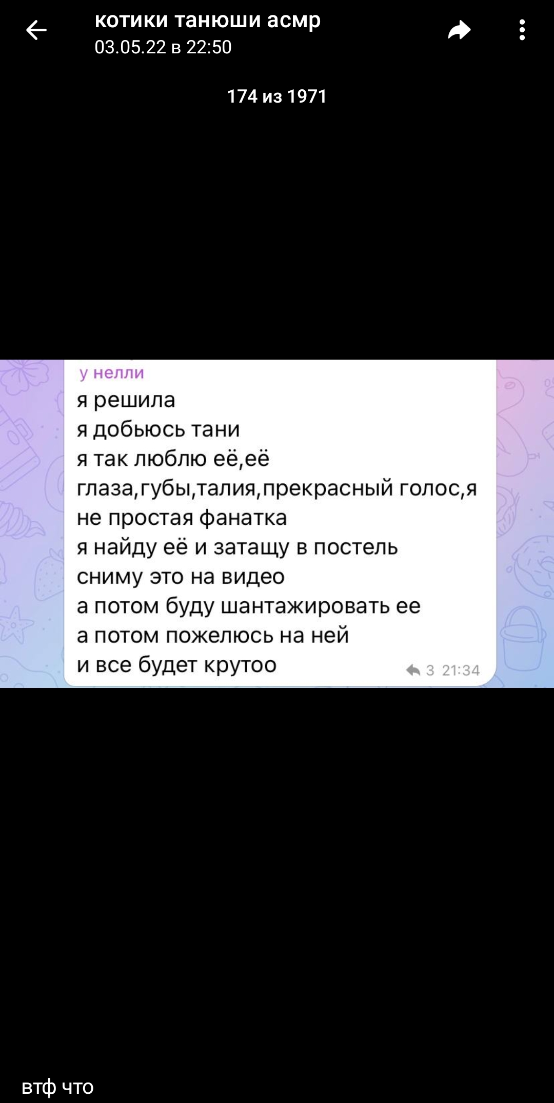 а вообще както слабо вяжется её скромность со всем этим асмр, если она сама заявляет что психически неуровновешанная по сути в жизни, но когда пишет кружки я хотя бы понимаю что она говорит, когда шепот еёный , я половину ниуя не понимаю, и дело не в шепоте а в том что на проглатывает слова. ну а такая банальная ошибка в словах от волнения сильного / стресса а также что русский скоро изза мгимо станет не её основным языком, у неё в голове уже больше английских слов .