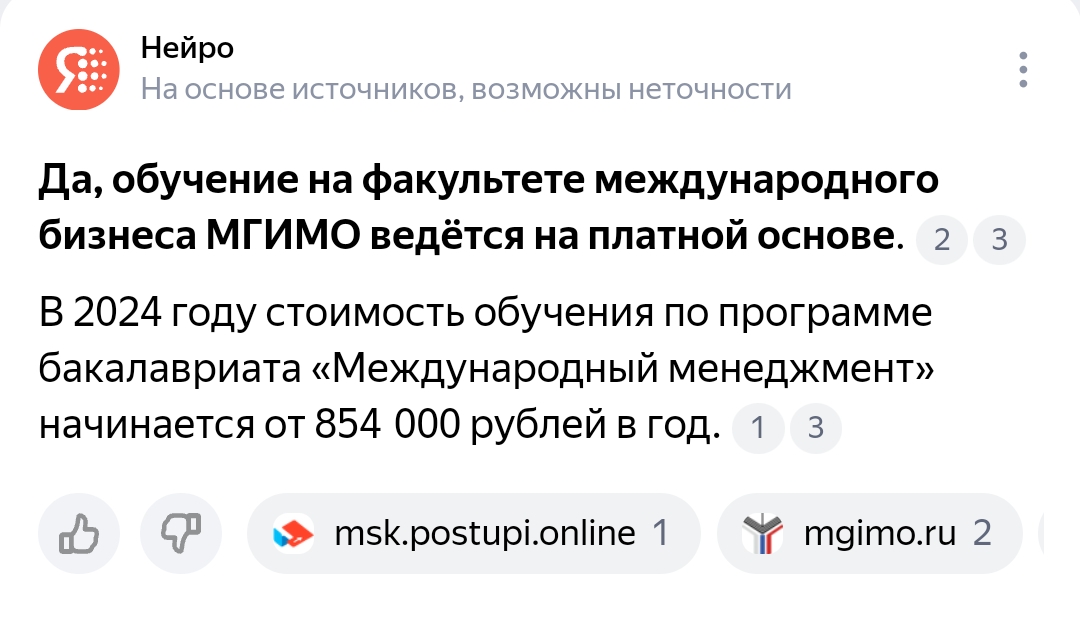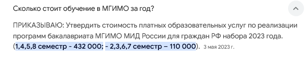 >>182836 Ну как сказать. Вот столько стоит обучение на ее факультете. Вся инфа есть на сайте мгимо. Раз донатить не просит и бусти не возрождает, то видимо ей норм. Так что, даня и остальные, можете подсчитывать сколько придется тратить на свою крашиху)