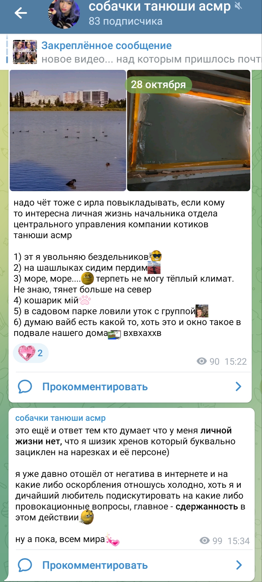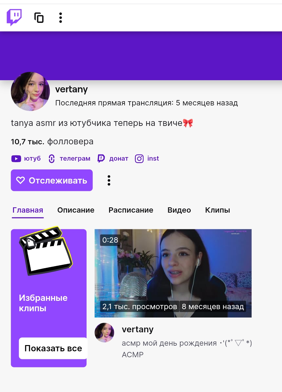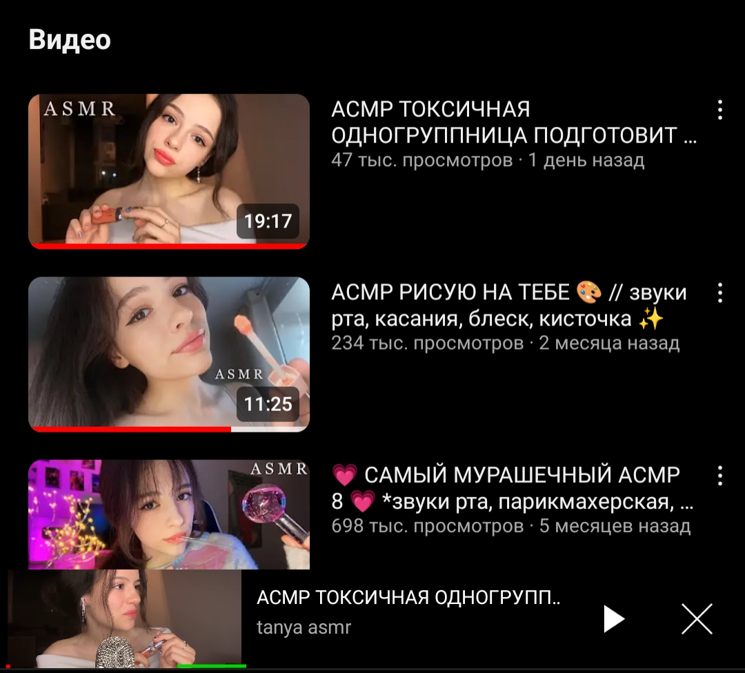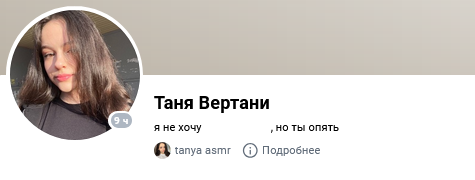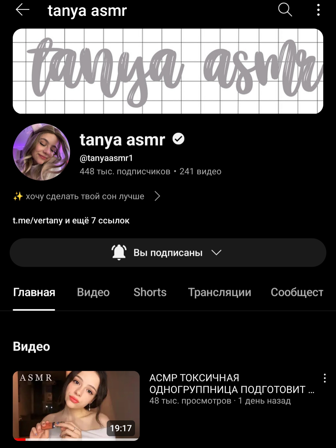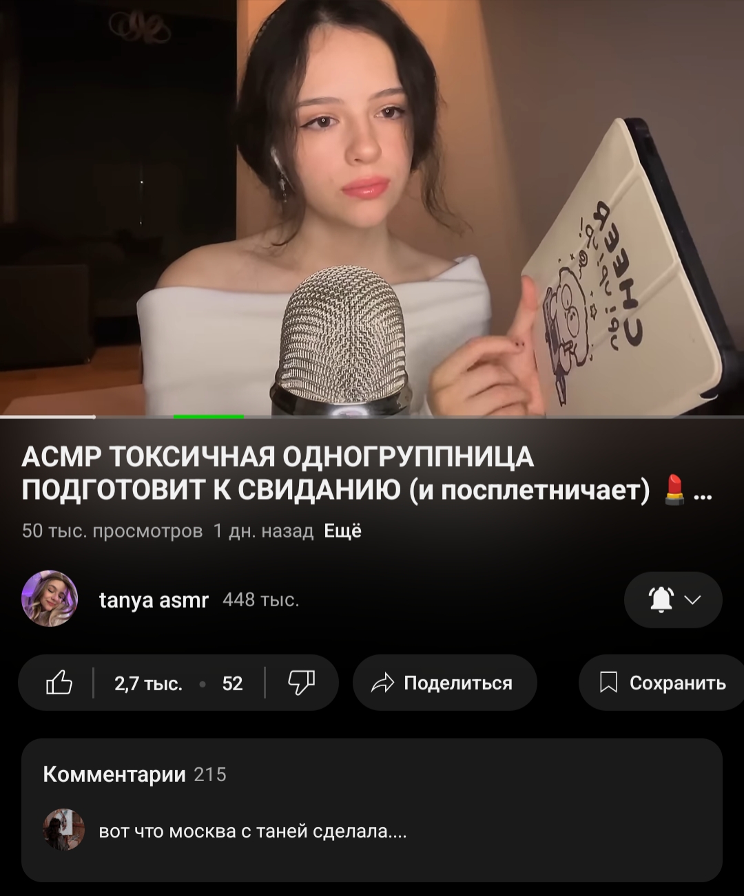 но это ещё один из бывших получается Тани, просто так на плечо девушка не будет голову. это у количеству бывших Тани и о том что она якобы скромная и забитая. совершенно нихуя. я думаю что её заебал уже этот асмр если честно, поэтому уже ни стримов ни видосов. она поняла что золотой кнопки не видать и погрузилась полностью в жизнь в Москве и... ну... учёбу...