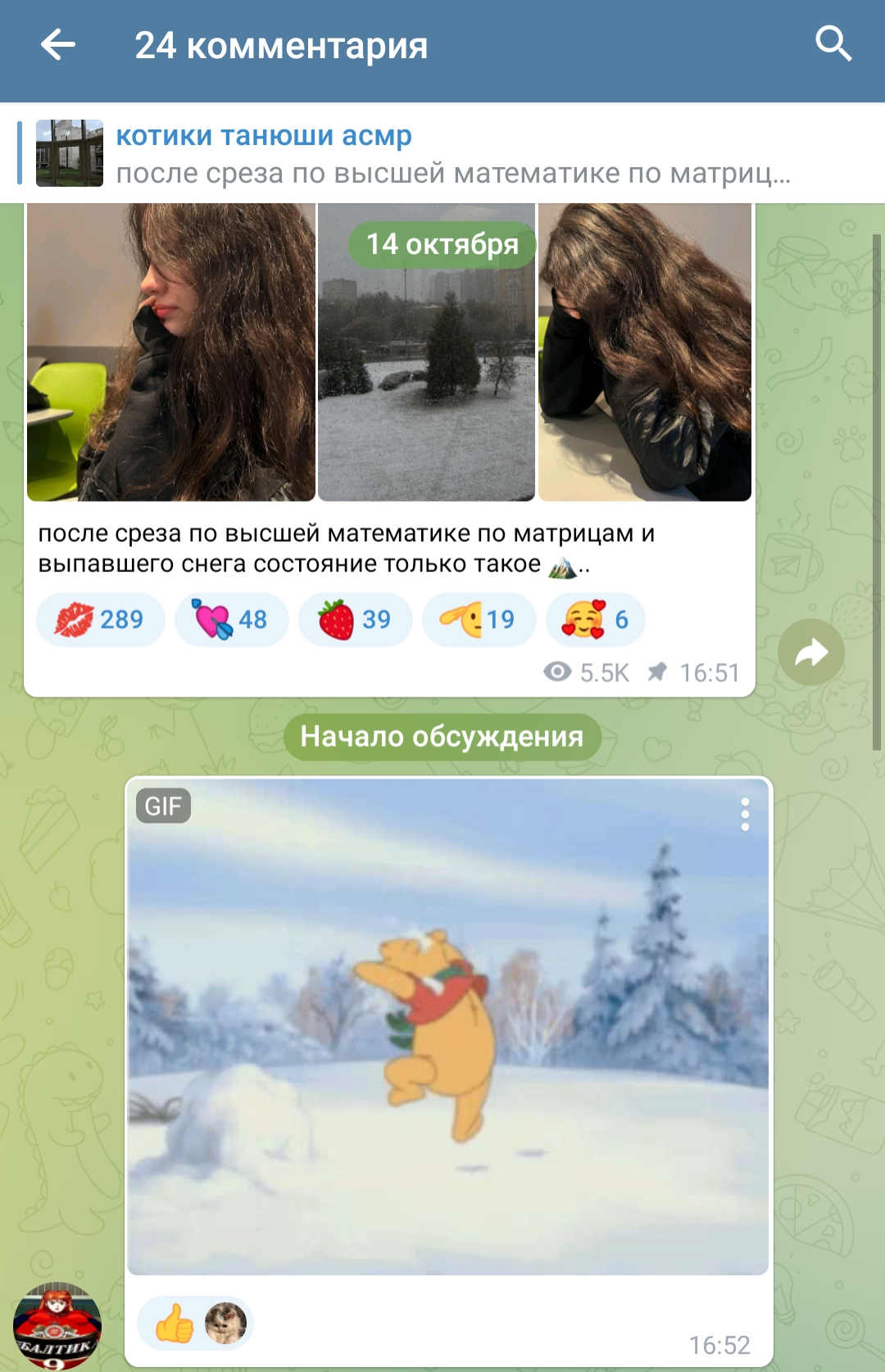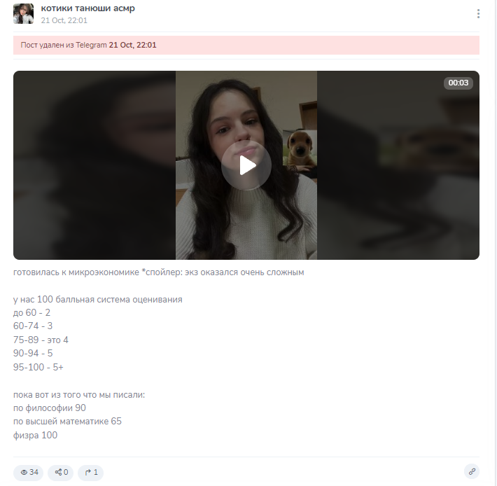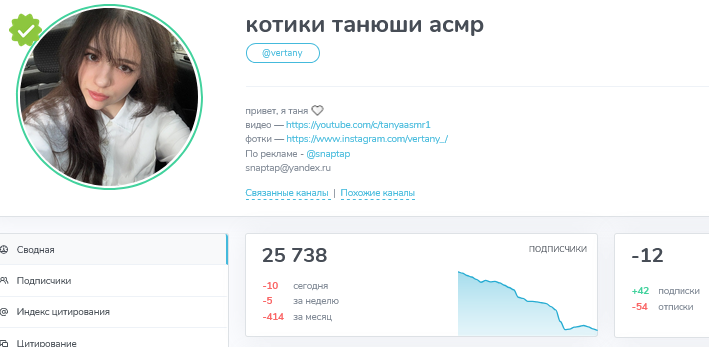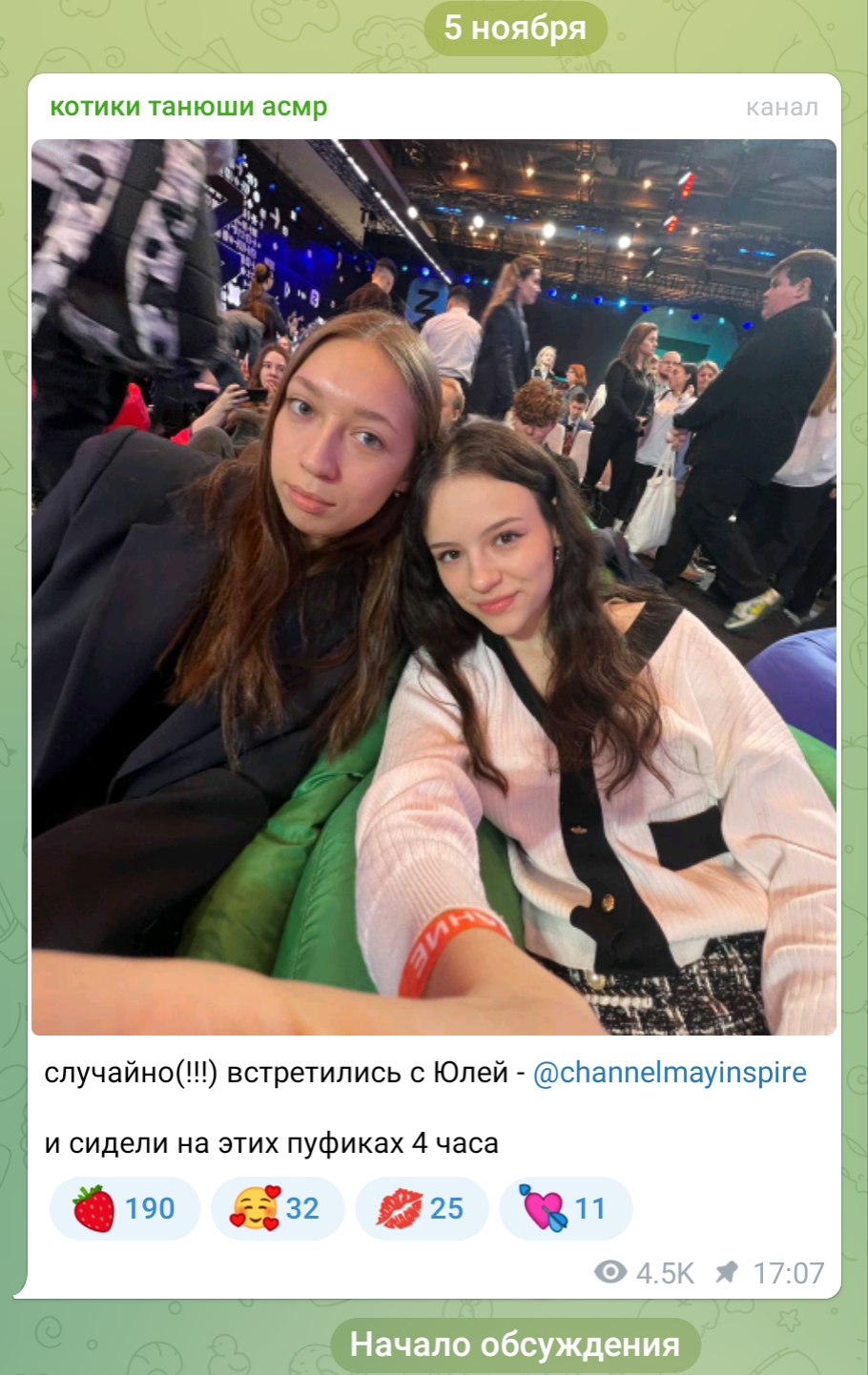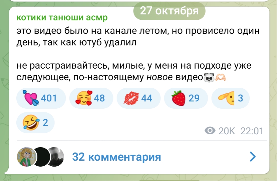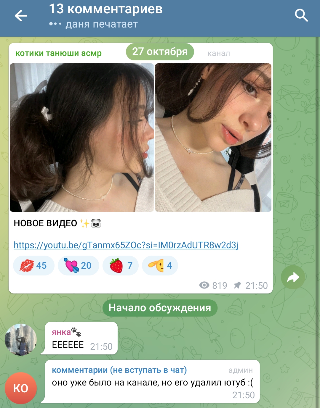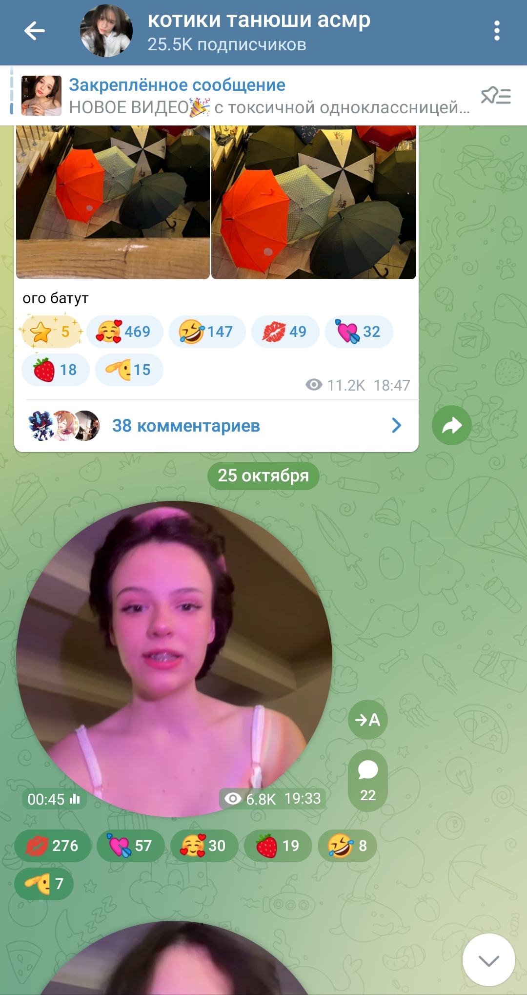 но это ещё один из бывших получается Тани, просто так на плечо девушка не будет голову. это у количеству бывших Тани и о том что она якобы скромная и забитая. совершенно нихуя. я думаю что её заебал уже этот асмр если честно, поэтому уже ни стримов ни видосов. она поняла что золотой кнопки не видать и погрузилась полностью в жизнь в Москве и... ну... учёбу...