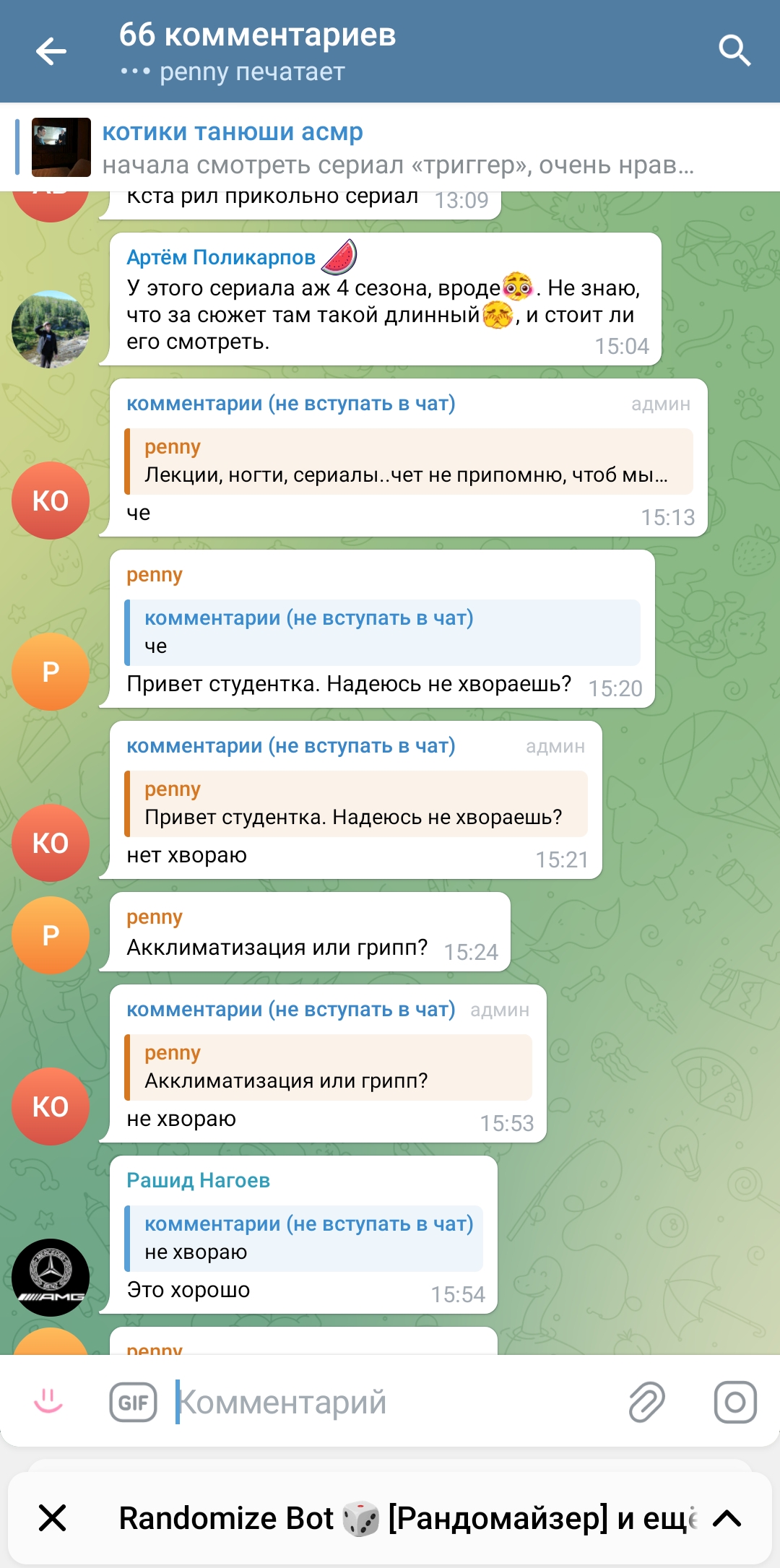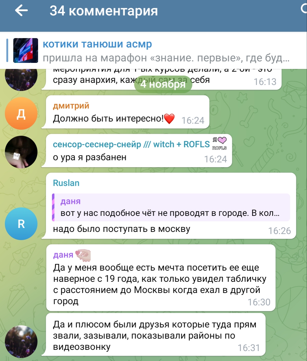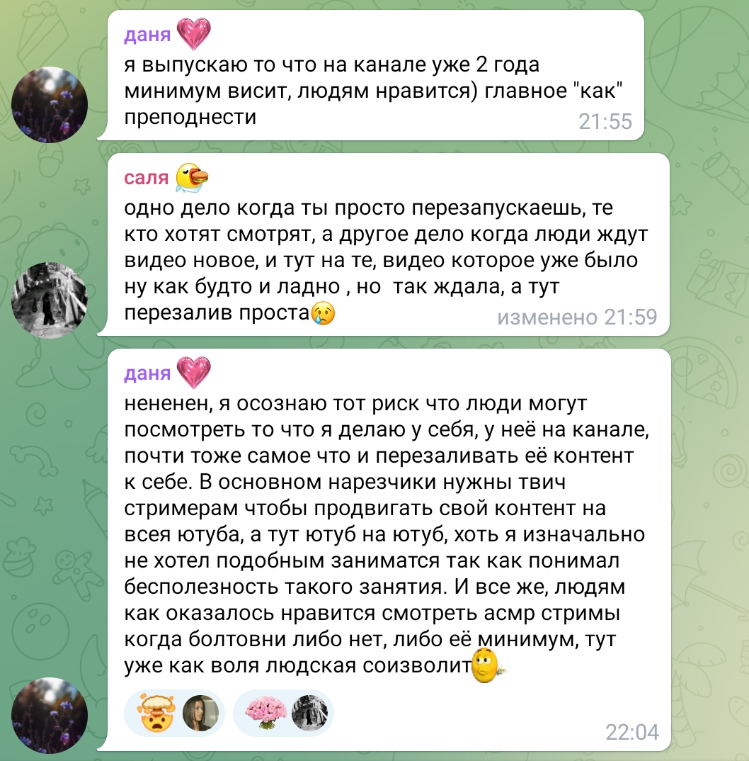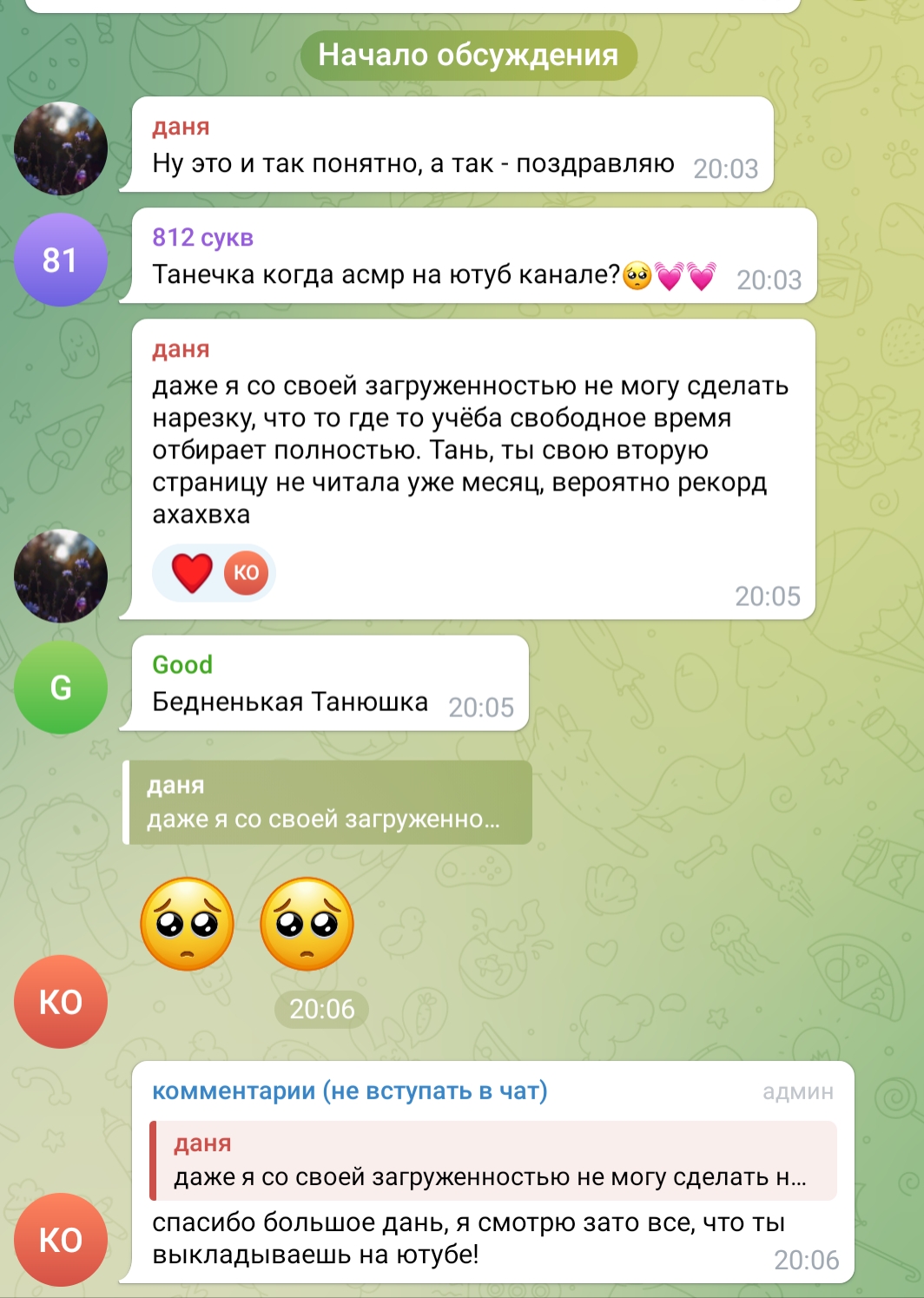 а вообще перекат помоему бесмыслено делать ибо уже в нём обсуждаются её подруги модеры симполизы но не асмр и не таня уже сама практически.