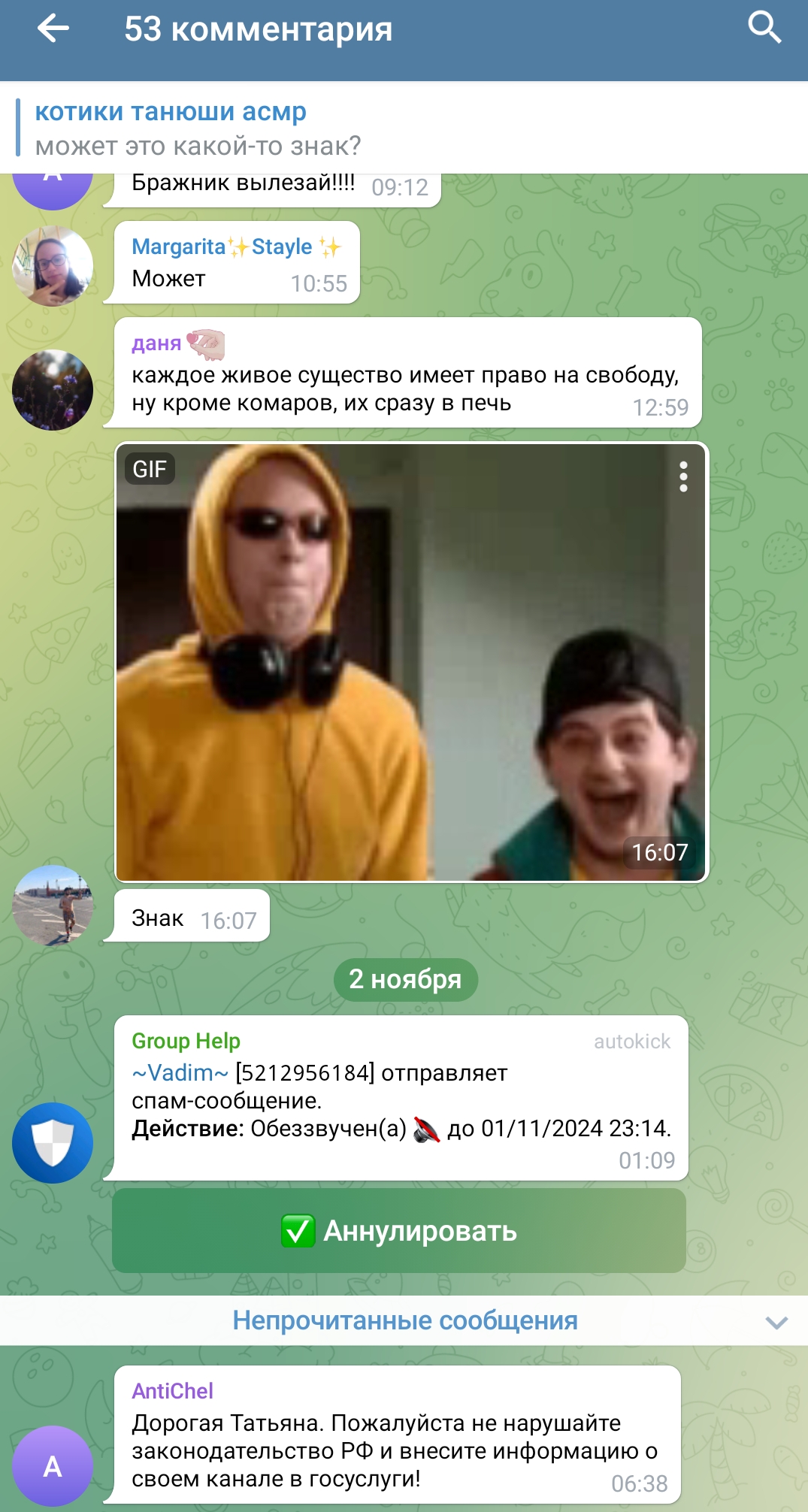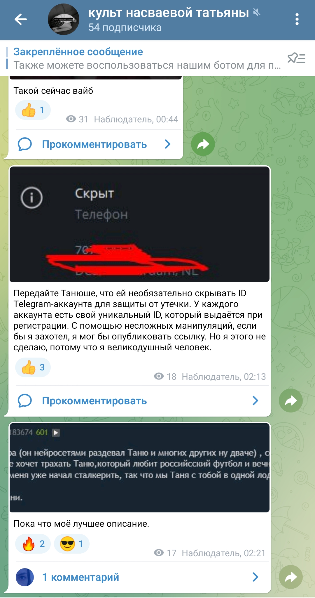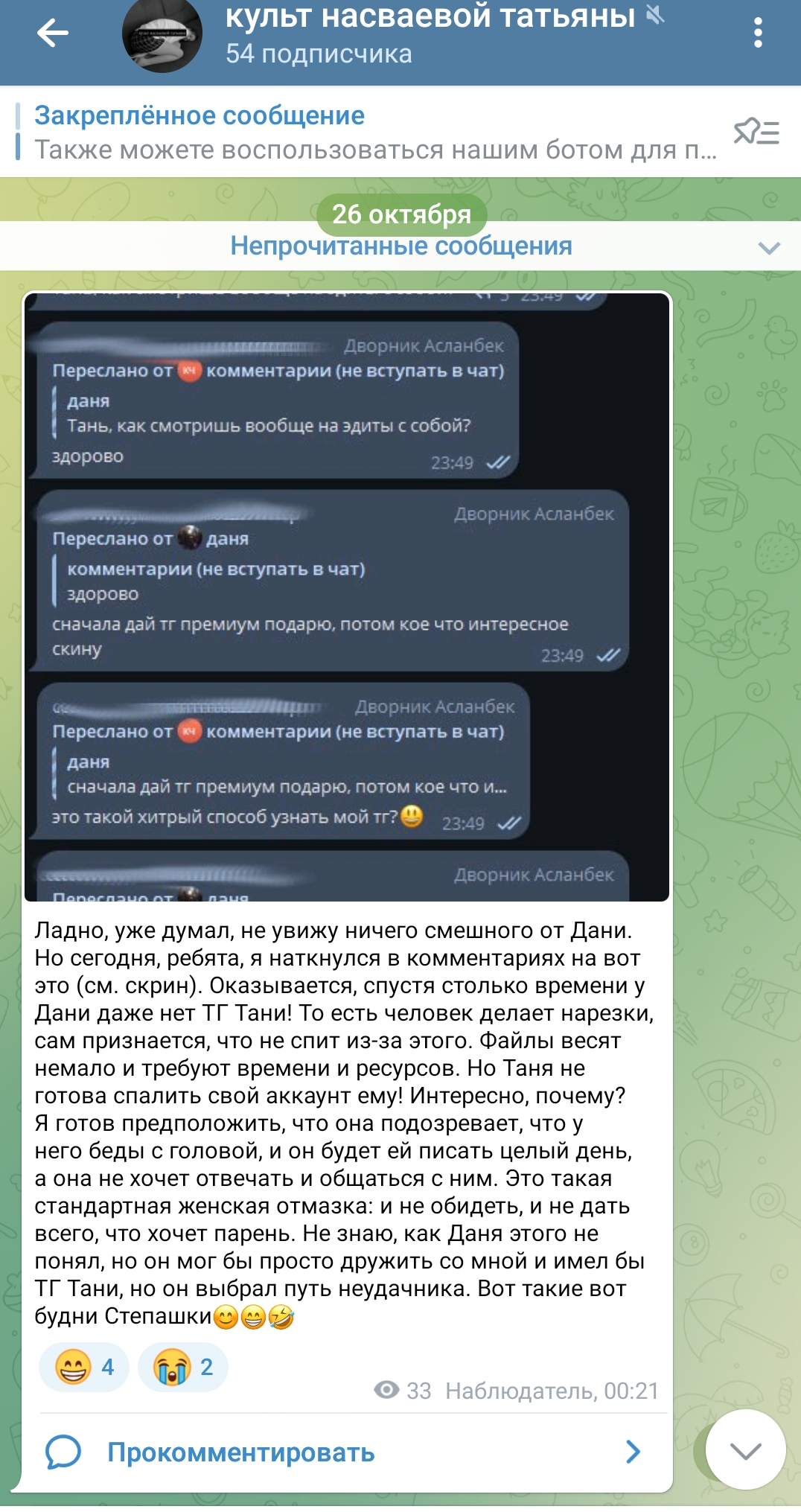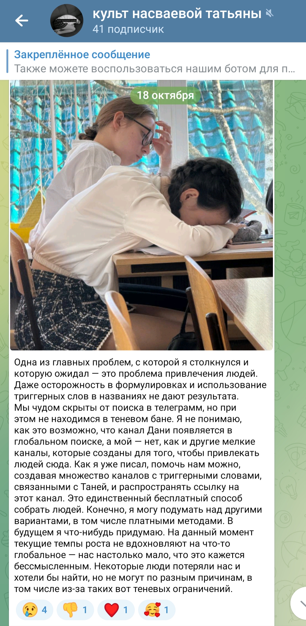 1. танин телеграм канал используется педофилами у которых дети есть 2. админ который видимо трахает Таню активно банит педофилов