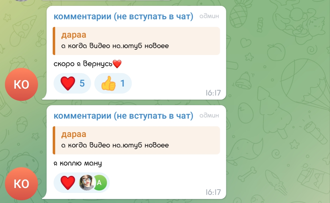 так что лично я вообще не обижаюсь. как тележные товарищи. ну активно которые отписываются и пишут ей когда видос.