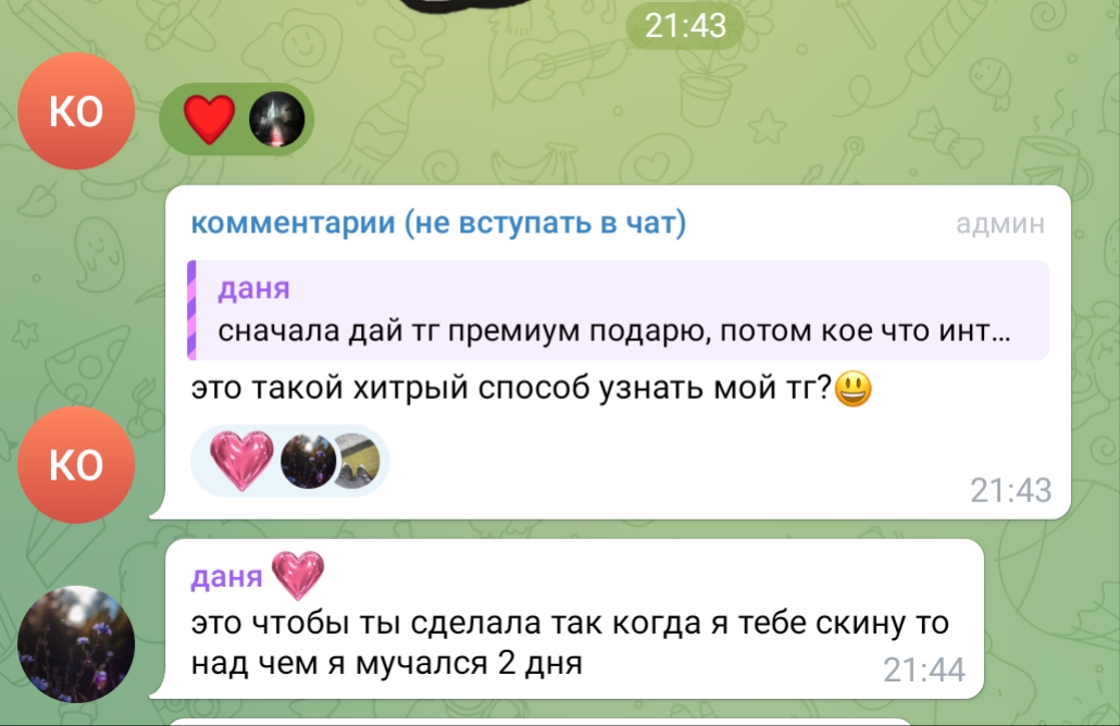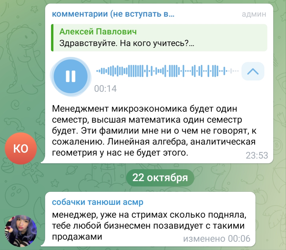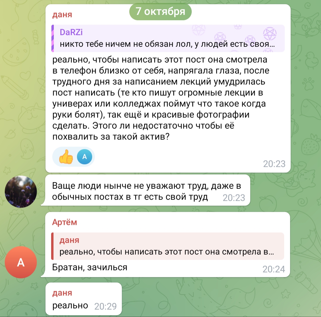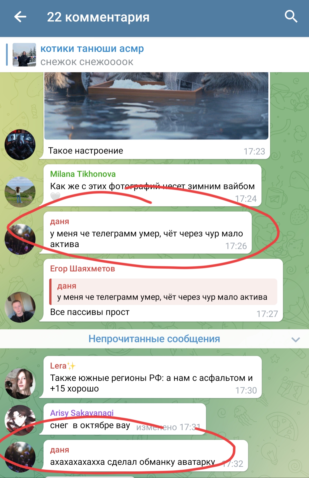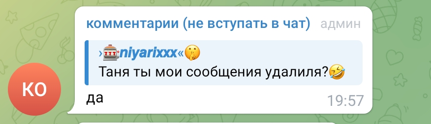 что я вам не пизжу что я сидел в Таниному телеграм канале. каким-то образом совершено безумие баг. она делает вид что ничего не было и что не в курсе двача что я тут пишу. конечно конечно. что ж. это проблемы дурова. и Тани. а не мои. я вам доказал что я не шиз и что не соврал про танину телегу. да это безумие юго я правда сидел 10 секунд владельцем её канала.