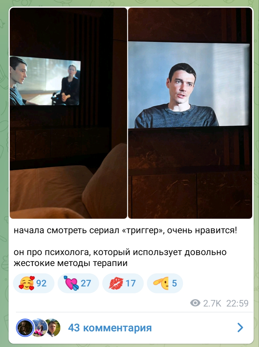 но так как ей одиноко, общение с близкой аудиторией в телеграме видимо её спасает сейчас, осень депрессняк. ногти вот сделала. сериалы смотрит. книги читает.