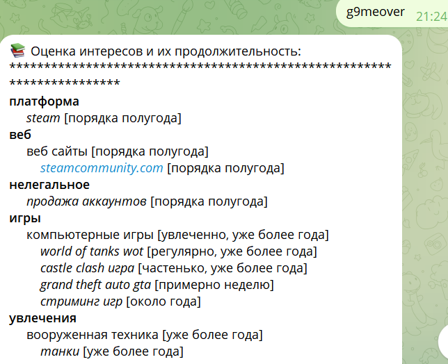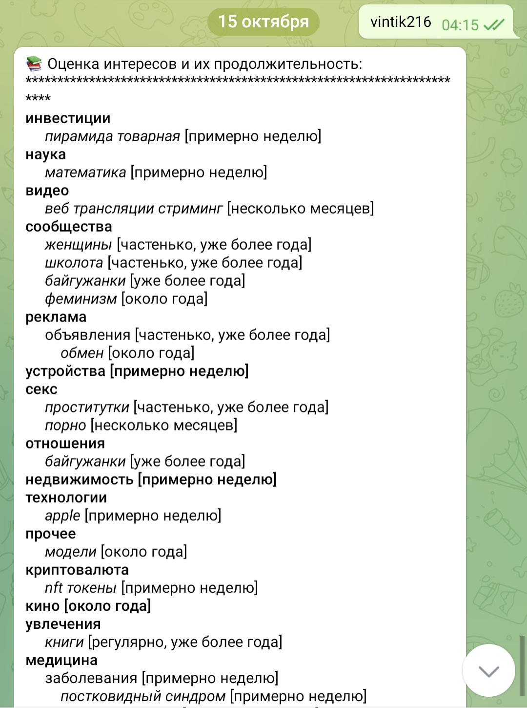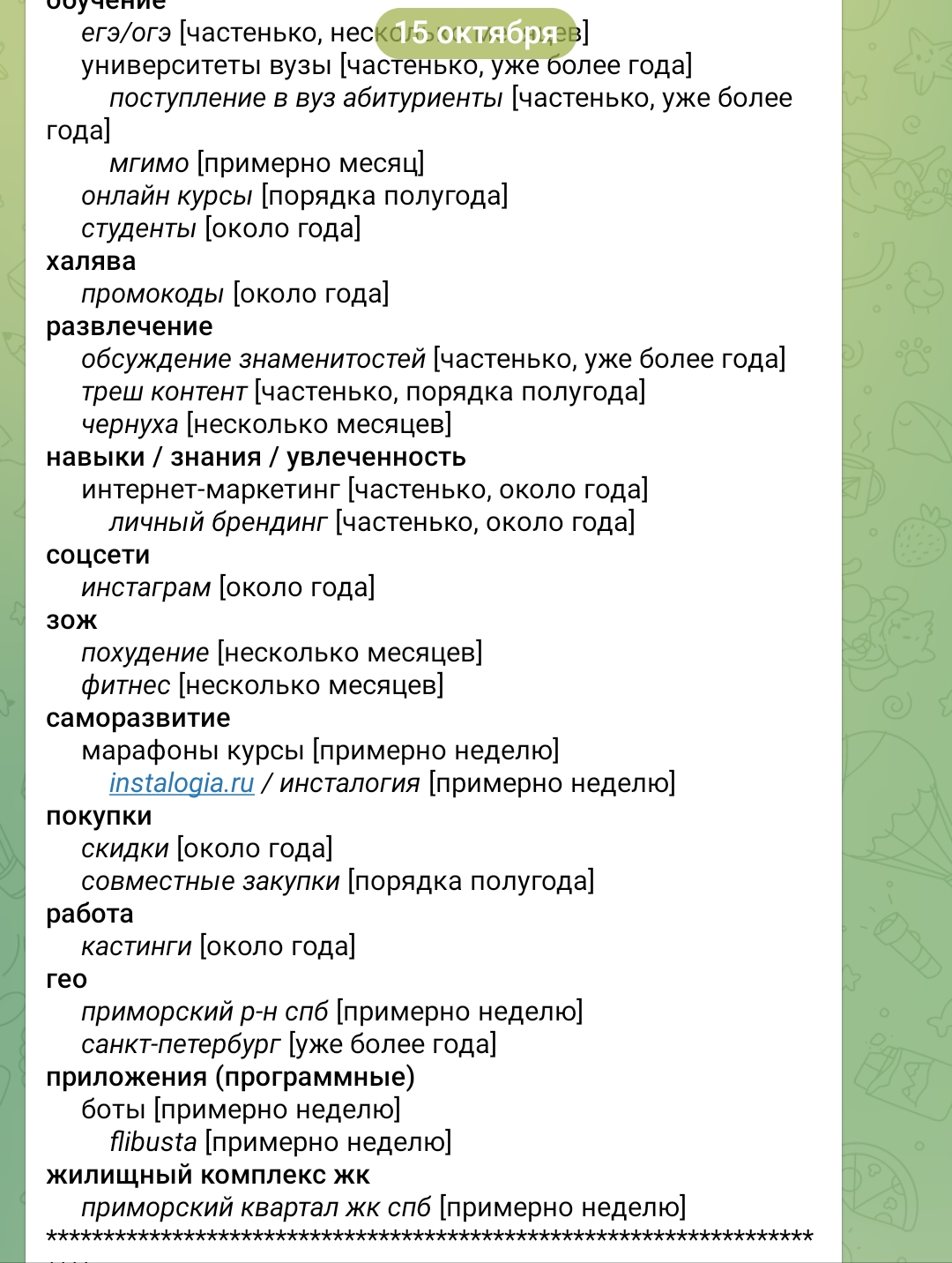 это пиздёж хотя бы потому что интерес айфонами точно у неё давным давно, с 8 восьмерки с детства. такие интересы больше подходят под её подругу Сашу. и пол Питер, у неё тётка, сестра её матери, в Питере. короче это интересы скорее всего всех с кем она больше общается в личке.