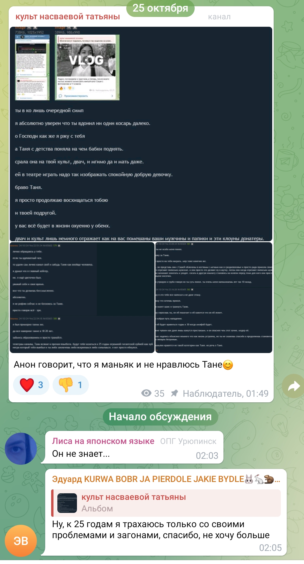 - все уже 8 тредов про Таню не несли никакой смысловой нагрузки - все оскорбления в её адрес являются шутками и юмором местным двачёвским - все мы уважаем и ценим творчество Тани и саму Таню - вся сливы являются не фейками, но началось это ещё задолго до создания первого треда на дваче, и Таня знает про двач, я с ней лично немного общался в личках, и несколько постов скорее всего лично ею сделаны (например фото на берегу в одном из тредов) - не обращайте внимания на местного долбоеба в треде, он в каждом треде пишет ебанину, есть на дваче и адекватные.