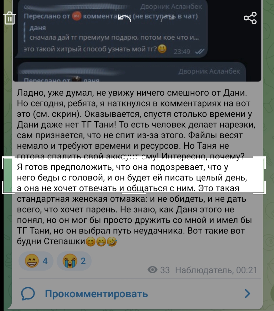 ни админ, ни даня, ни любой другой поц из телеграм канала таниного никто не женат . и ни у окго нет бабы. и тане они также не нужны.