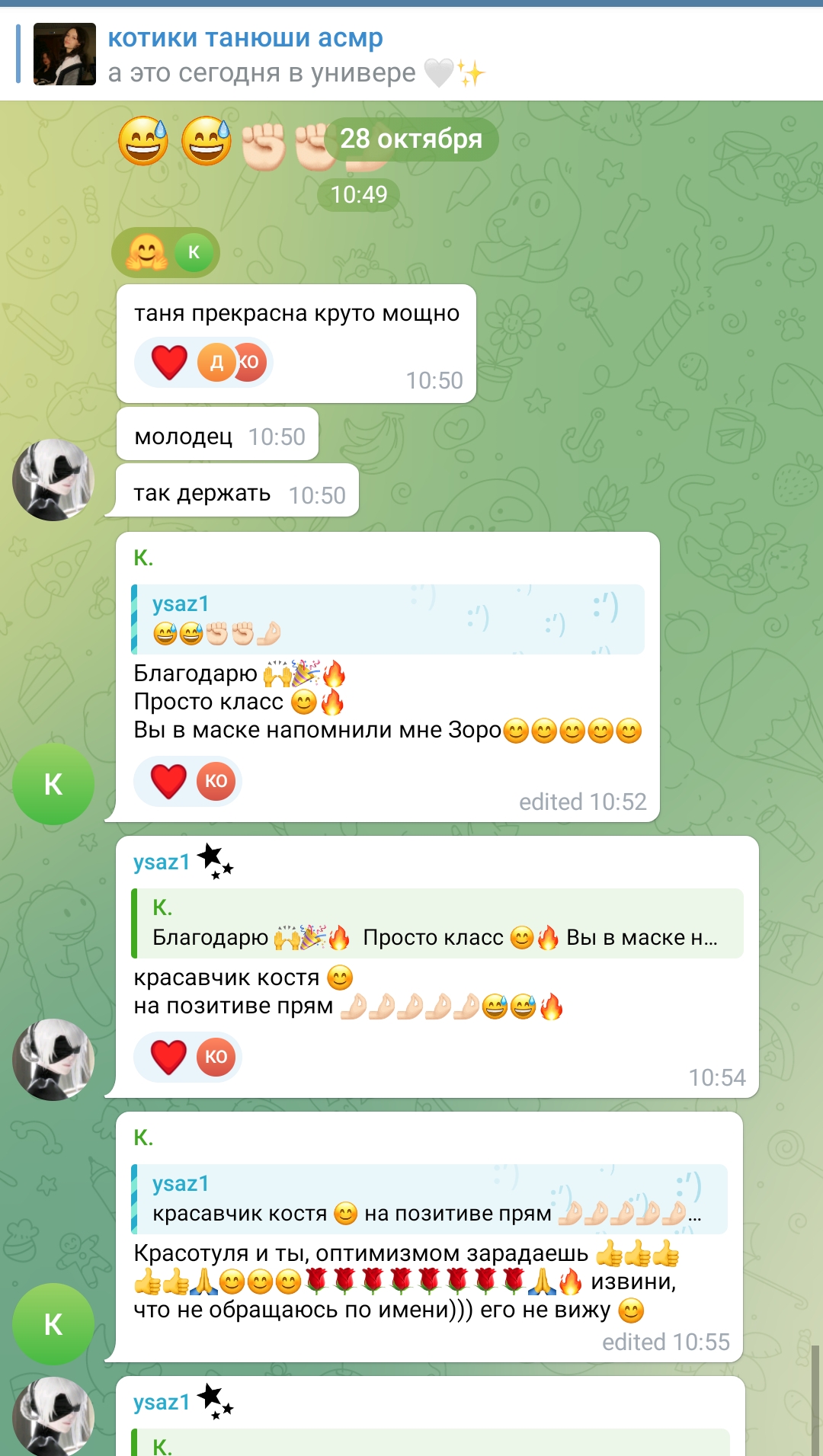 и не забывайте, Таня настолько уверена в своих силах что всё что она выпустит будет на сотни тысяч просмотров в то и миллион. и в этом ваша заслуга. те кто описывается от телеги - все равно подпишутся потом.