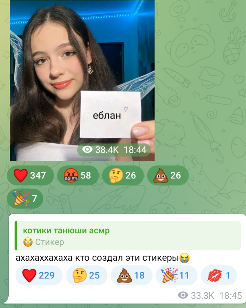 1. дальше меня заебало листать 2. к вопросу зачем она перевезла в Москву свое кресло, а также кто же её сестра, где отец, кто все таки мама, зачем ей брекеты если ровные зубы и что за собака лаяла на стриме что за кошка рожала у неё там, ещё вопрос, у неё айфон односимочный, но два аккаунта вк и телеги, зачем она таскает два айфона если можно было купить двухсимочный.
