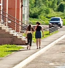- они идут вдоль своего дома и под своими окнами - проссто так там не гуляют дочки и матери ибо там впереди нчиего нет лишь поле - любимый черно белый стиль одежды и она лишь немного ниже матери а так длина волос именно танина, она её не меняет, ну и сзади мама тани такая ибо талия охуенная.