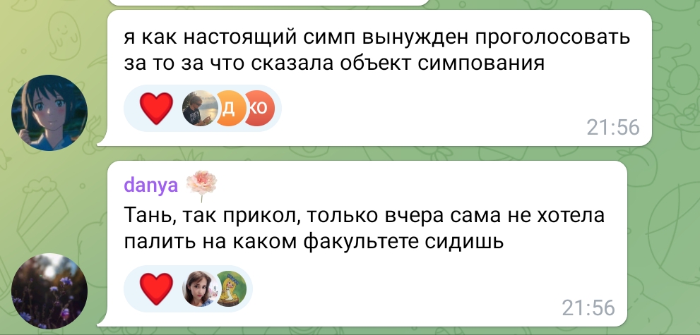1 - в каких обстоятельствах? у тебя даня есть личная жизнь и девушка в ещё учёба и другая работа. тебя, Таня, официально послала на хуй, жаль что она лишь подгодала к тому донату и заболела, чтобы казаться нитакусей и свалить все на болезнь.