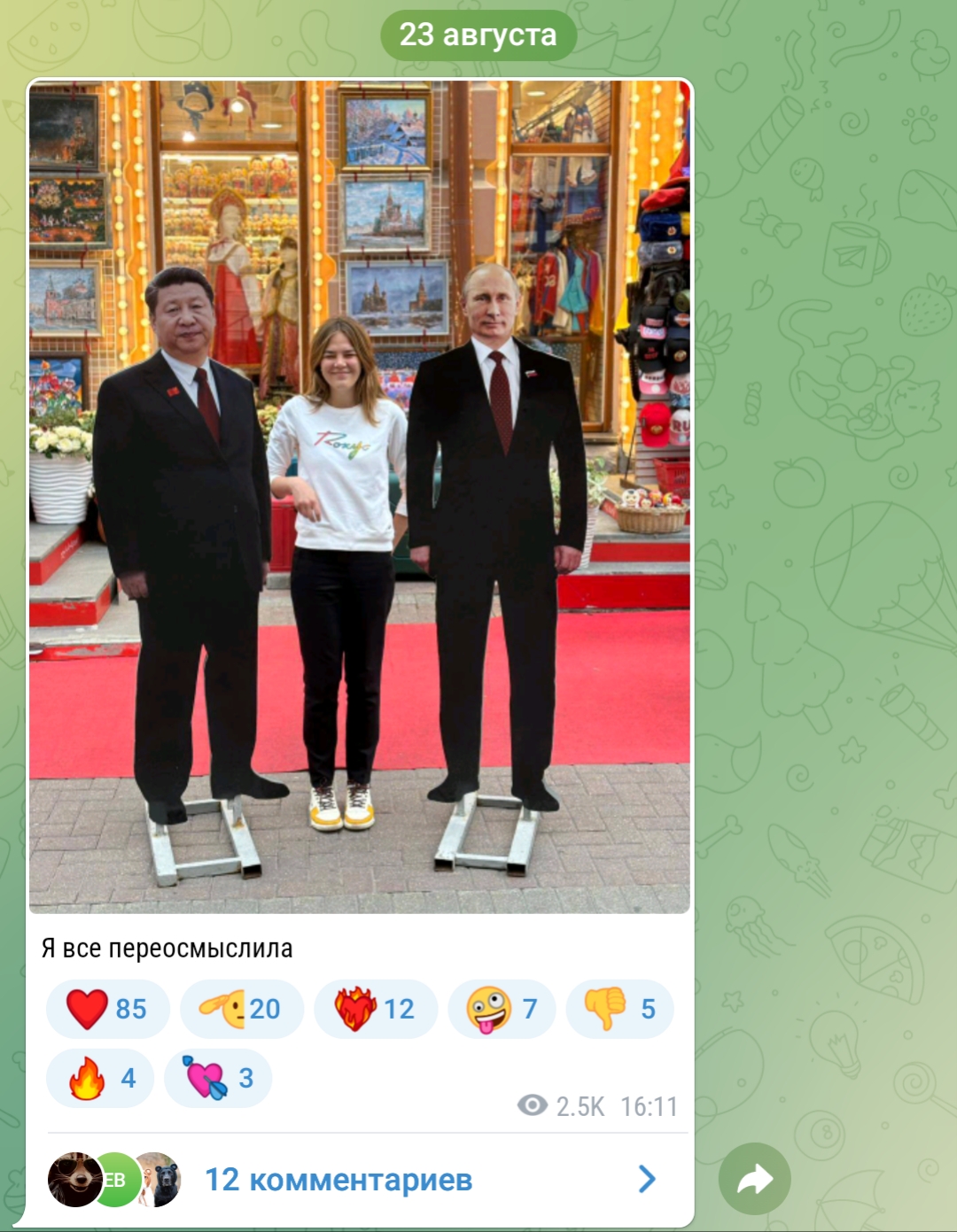+ в августе в телеге комментарий, я сюда скидывал. юная москвичка издалека увидела Таню возле метро. и позже оказалось не пиздела. она реально у той станции и обитает где мгимо.