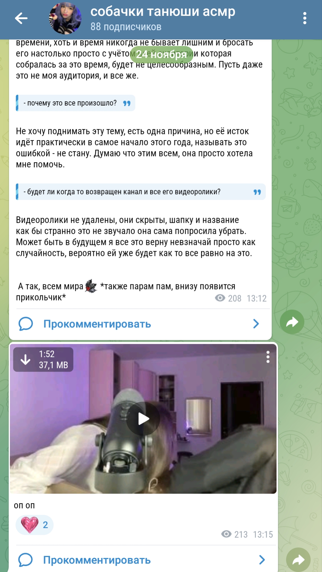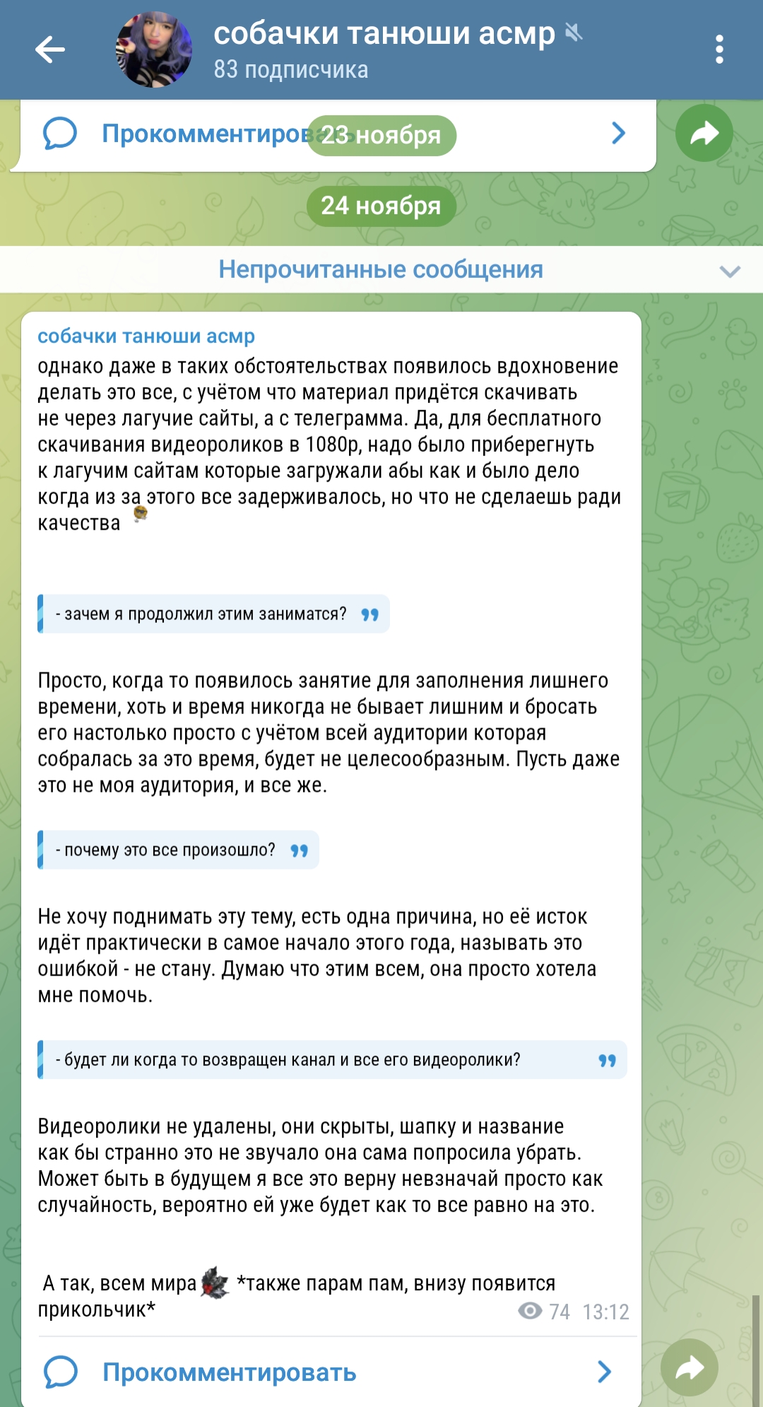 удалить вк аккаунты, и личку тг закрыть ты конечно молодец, но лучше б ты своим друзьям подругам запрещала себя снимать, а если не хочешь читать комментарии какие-то, причём адекватные нормальные, просто они тебе не нравятся, и это учесть что за 5 лет ютуба какой только хуйни не читала в свой адрес, значит у тебя что-то с нервами вдобавок к тому что с тобой сейчас, ну или страх смерти банальный и это нормально... но похоже твоей карьере наступает пиздец, пневмания тебе видимо усложнит жизнь дальше привыную ютуберскую...