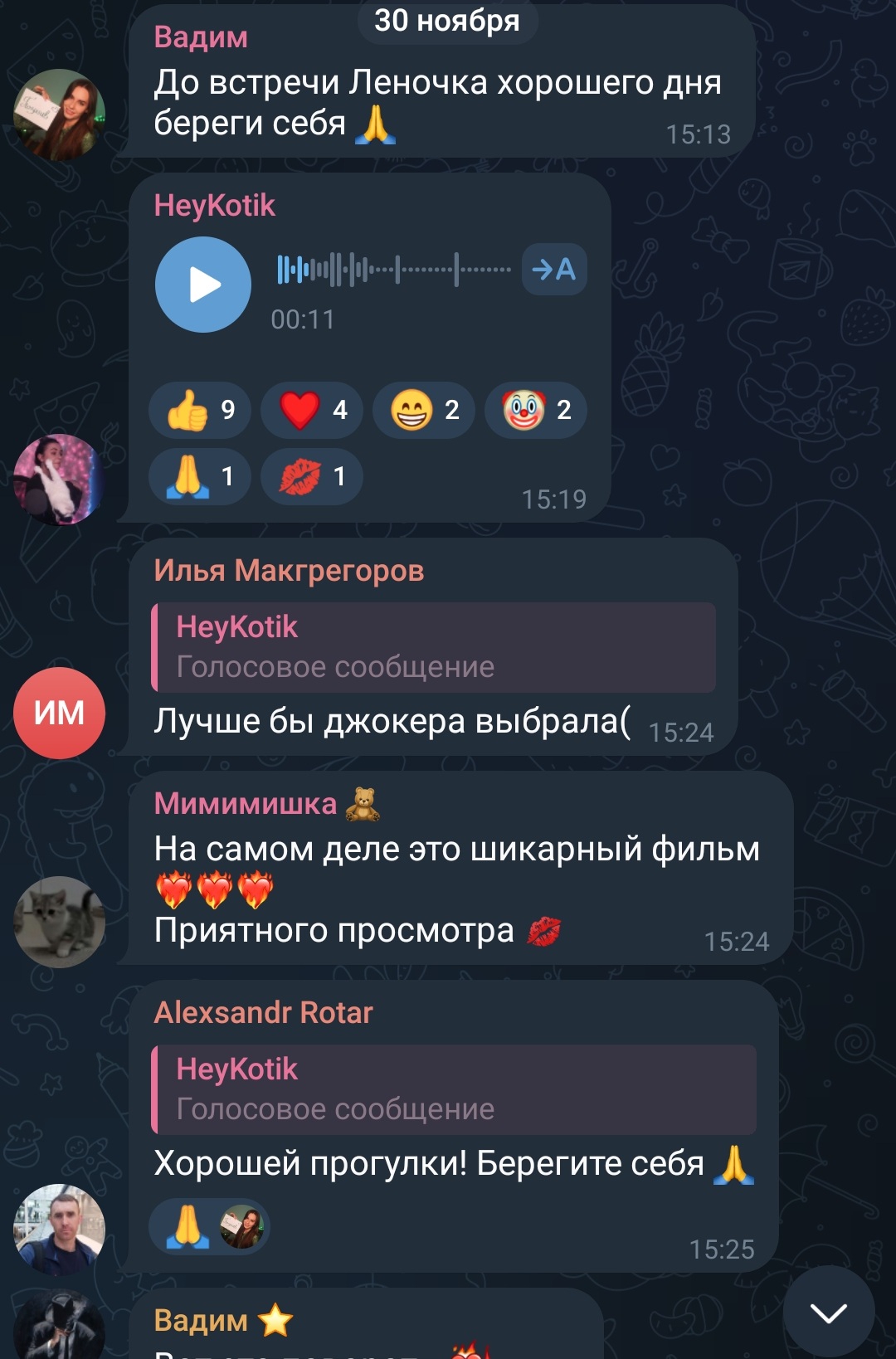 Лена у себя в тг голосовухой вещает следующее: "ахаха, ахахах, победил фильм "Клятва" но мы всем чатом что-то его не захотели смотреть ахах ахаха, и донатер, который поставил на этот фильм разрешил выбрать фильм на мое усмотрение ахах ахаха, и я всегда за справедливость ахаха ахах но в этот раз сделала исключение, потому что фильм спорный ахах ахах и витоге выбрала сама, потому что я за справедливость ахах ахах"