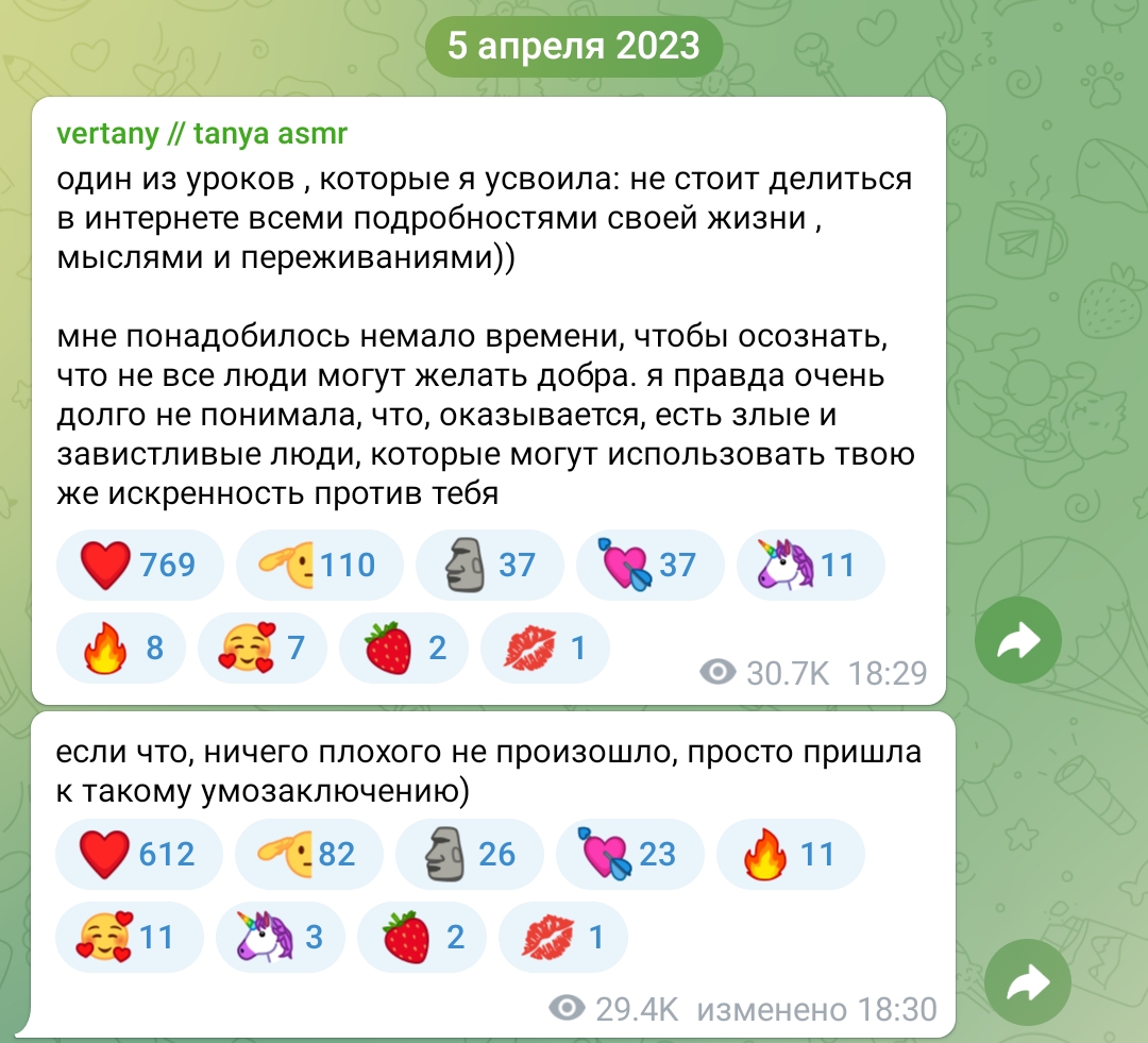 - удалила. это так жёстко выглядит со стороны, когда в прямом эфире сыпятся сообщения, и ты будьто одновременно с Татьяной в экране... и интересно почему ей не до сна в 4 утра, но может сериал или плакала или проснулась.... - и вторую сторис я так и не увидел..... никогда больше не узнаю что в ней было