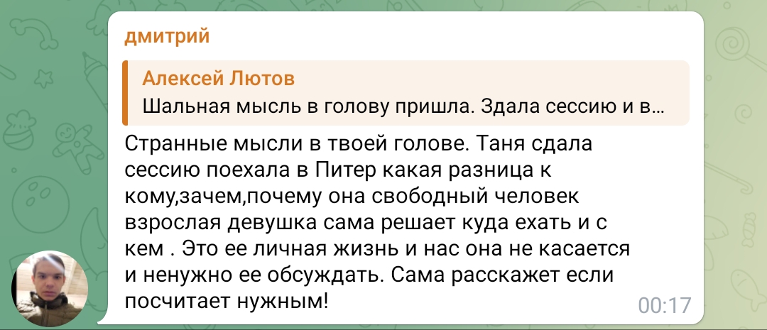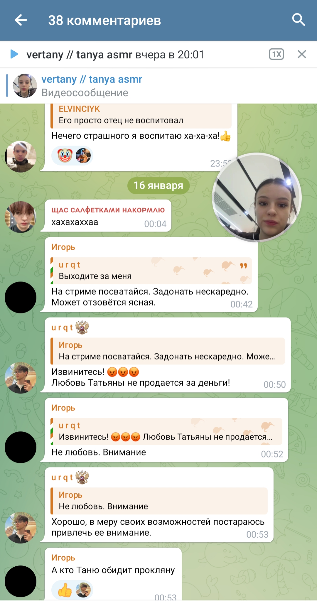 Только ребята давайте так, больше сюда ничего не пишем, раз мне желаете сдохнуть вместе с Татьяной. А общайтесь у дани на канале. С ней вместе. Все всё поняли? Или создавайте новый тред.