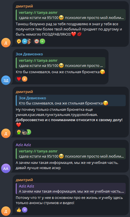что обсуждаем всяких её топ донатеров. переживаем за благосостояние дебитрия эрекцию вани и бывших хохлушек дани. я уверен что она сбилась со счету сколько подобного у неё было уже за 5 лет существования проекта tanya asmr. и купить трусы её купить хотели предлагали наверняка и стать первой и хату переписать хотели может кто-то за кое какую услугу и прочее...
