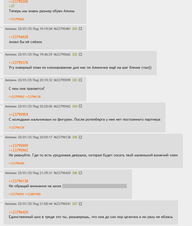 >>192219 Я говорил, что плохая, имея в виду её отношения с парнями и то, как легко она их меняет, создавая олений хоровод. При этом она не забывает упоминать свой горький опыт с кавказцами. Мерзко, что всё это на её канале, где она рассказывает, что ей подарил очередной олень, и снимает их без их ведома в свои кружочки — как они стоят с цветами под окном, и больше их никто не видел. Я даже не имел в виду что-то другое, так как она реально простая нормиска, в отличие от Татьяны, которая — невротическая ведьма с фетишем на унижение. И да, Саша грудь не покажет, я уже просил.