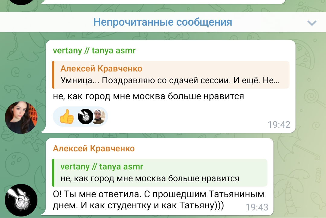 я не буду мериться с тобой пиською. я уважаю твои труды. но раз она тебе не дала.значит не судьба. насчёт моих шансов. она не знает о моём сосуществовании впринципе. ну или ржала с моих файлов . может ей ваня скидывал. без понятия . но ты уже понял. тане насрать на тебя. как бы грустно это не звучало. ну или давай всю свою кипту сливай на неё. я без понятия. может она тебя там вдург любила когдато.