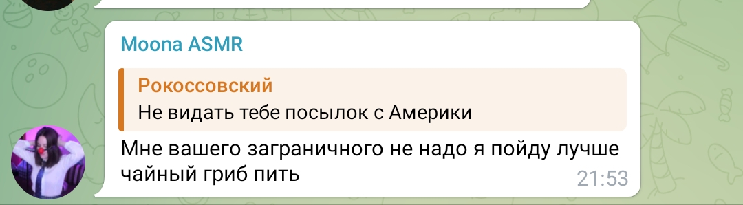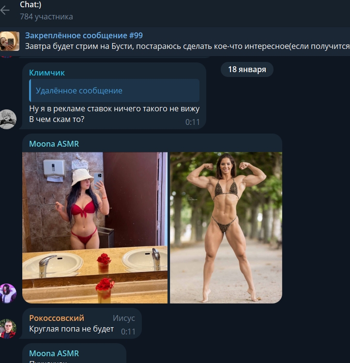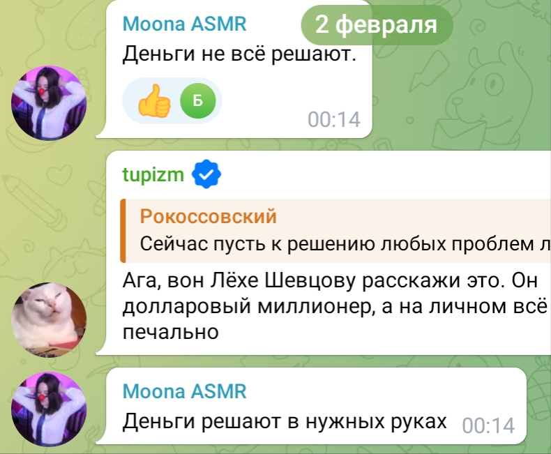 Я так понимаю, основной контент теперь не на ютубе и не на бусти даже, а в чате голосовыми. ей в общем очень скучно живётся. детей нет, работать не надо, пухляшу не готовит видимо, доставки, 30 лет почти бабе. и она как бы пример для остальных баб, хотя походу её лишь мужики смотрят 40летние которые каким-то чудом не лежат в дурках, а работают и донатят ей. что её модеры, что остальные. ей везёт, у неё действительно много иностранцев даже в чате.