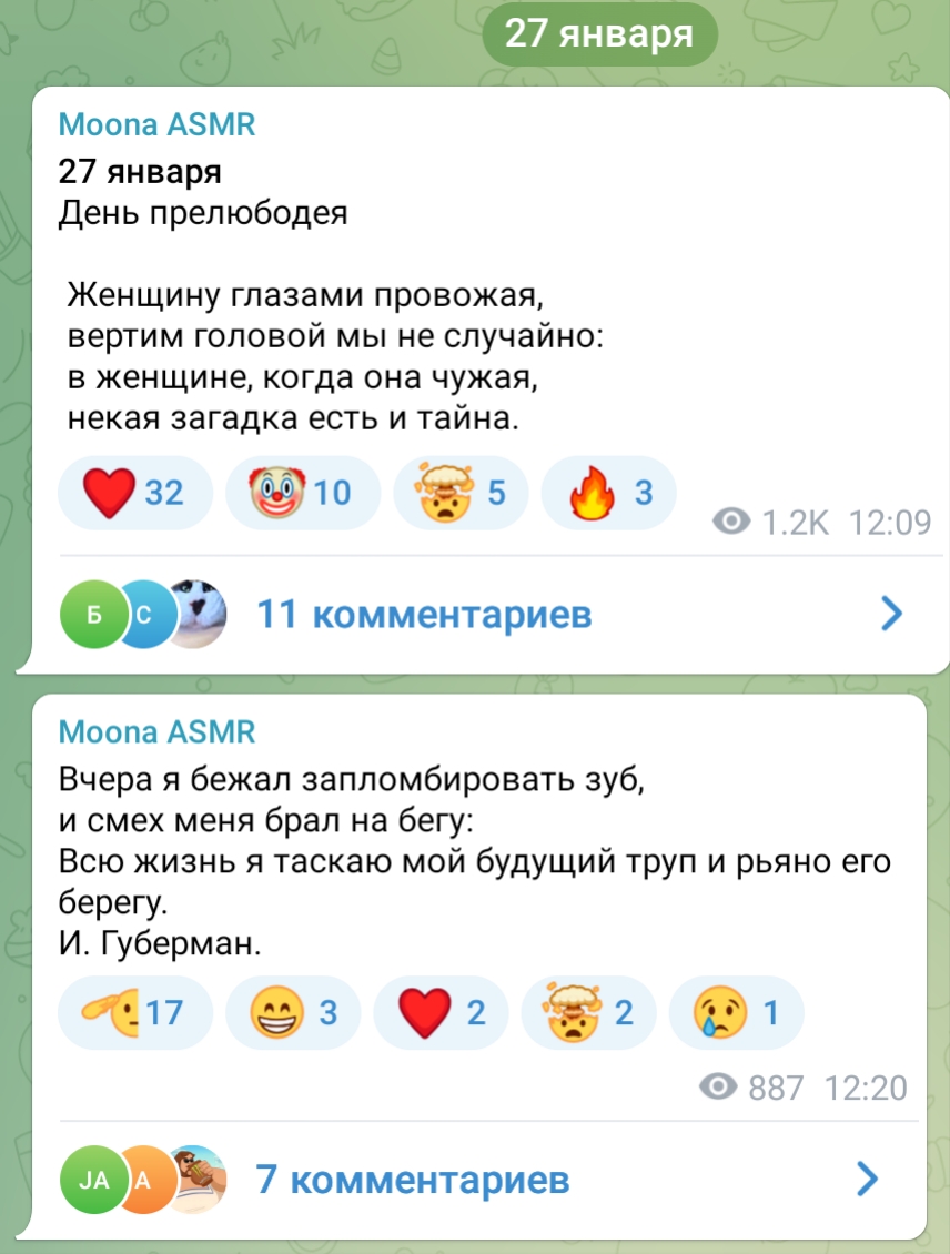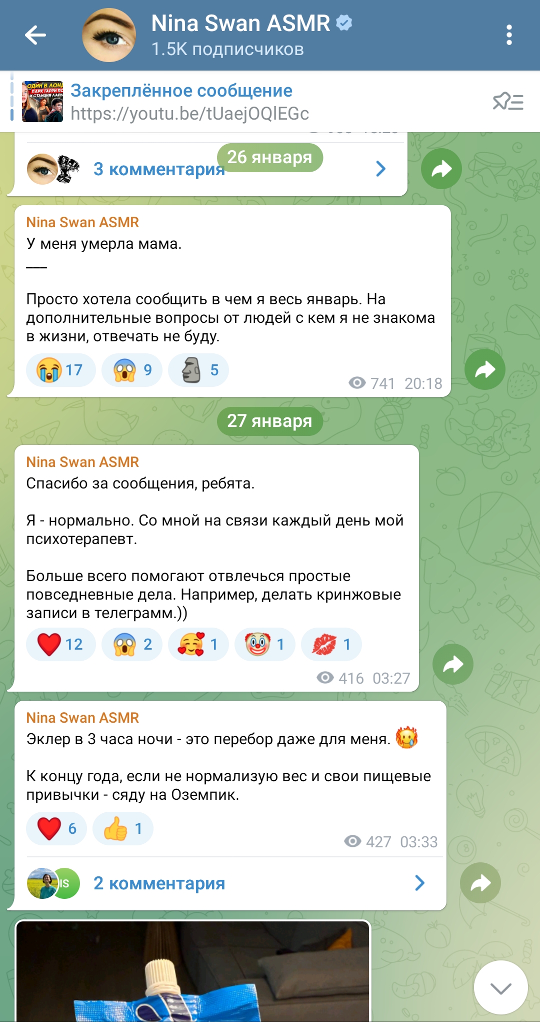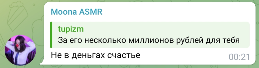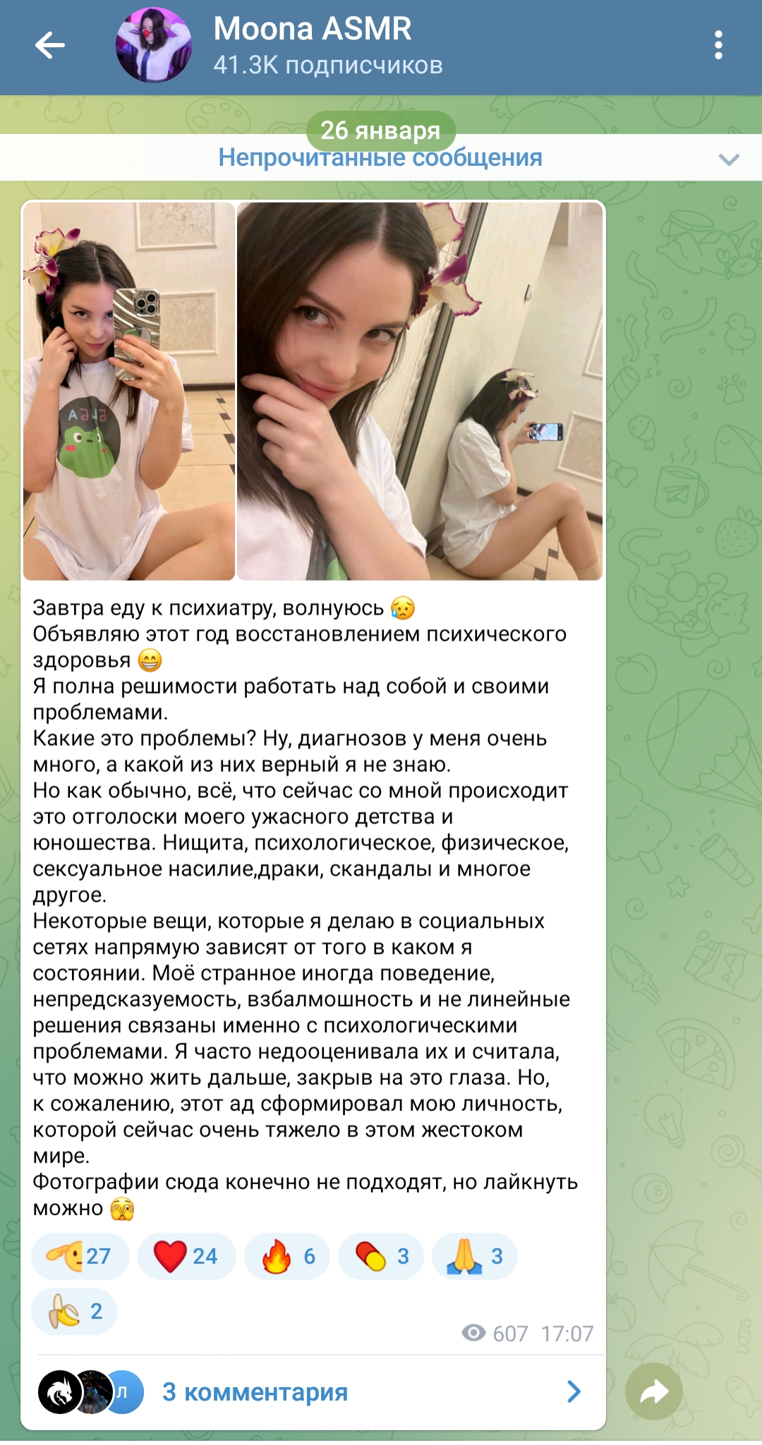Не понимаю что у этой ебанушки в голове. Как она вообще связала секс контент и делиться о семье и чувствах? Пишет что ей интересно мнение об этом и тройка челов уже отлетели в баны или жостко почистили комменты:D Ну вот один челик красава конечно. Может до Таньки дойдет, что всем похуй какой она человек и какие видосы асмр снимает потому что точка невозврата пройдена в сторону оголенки.