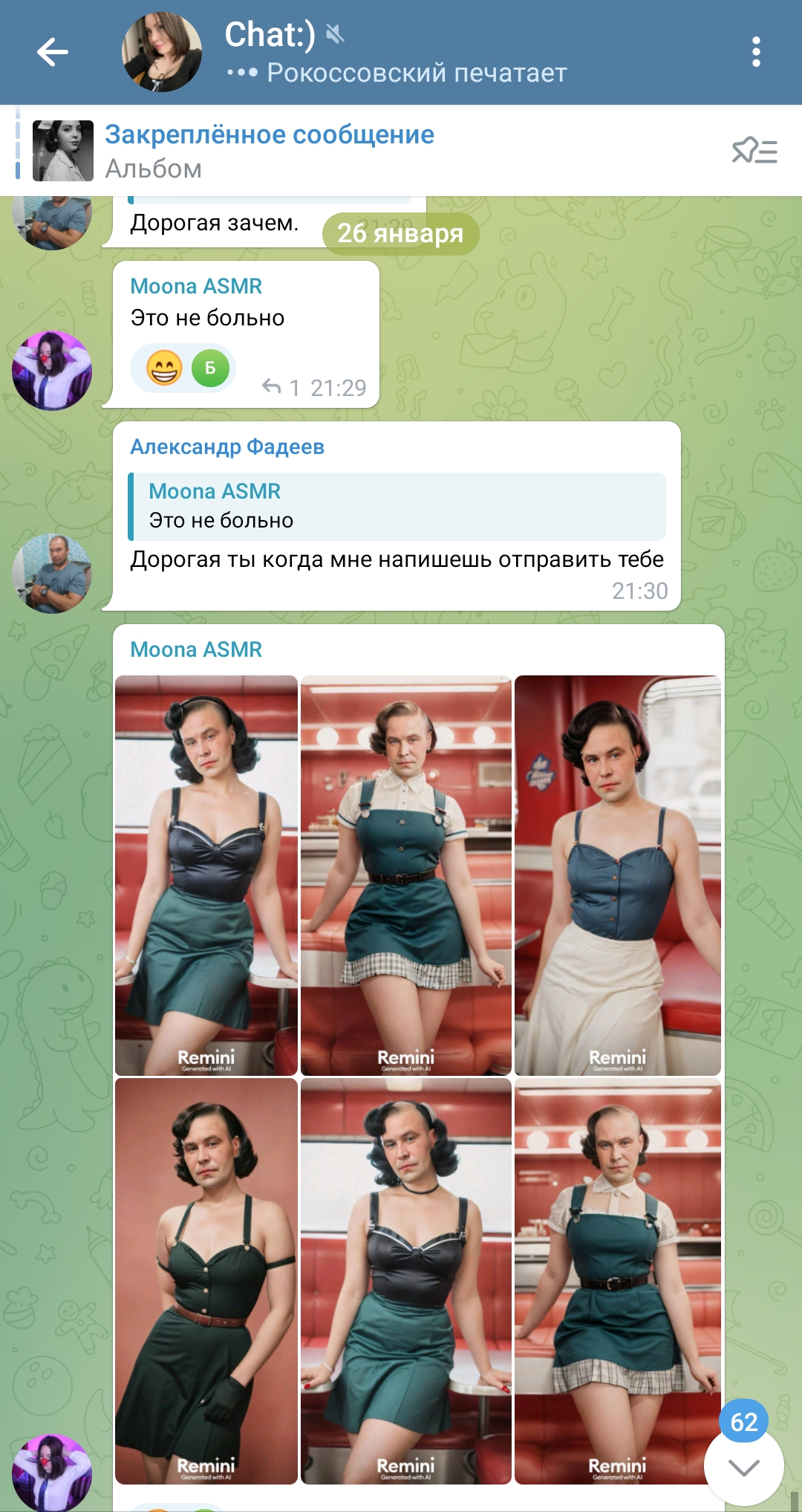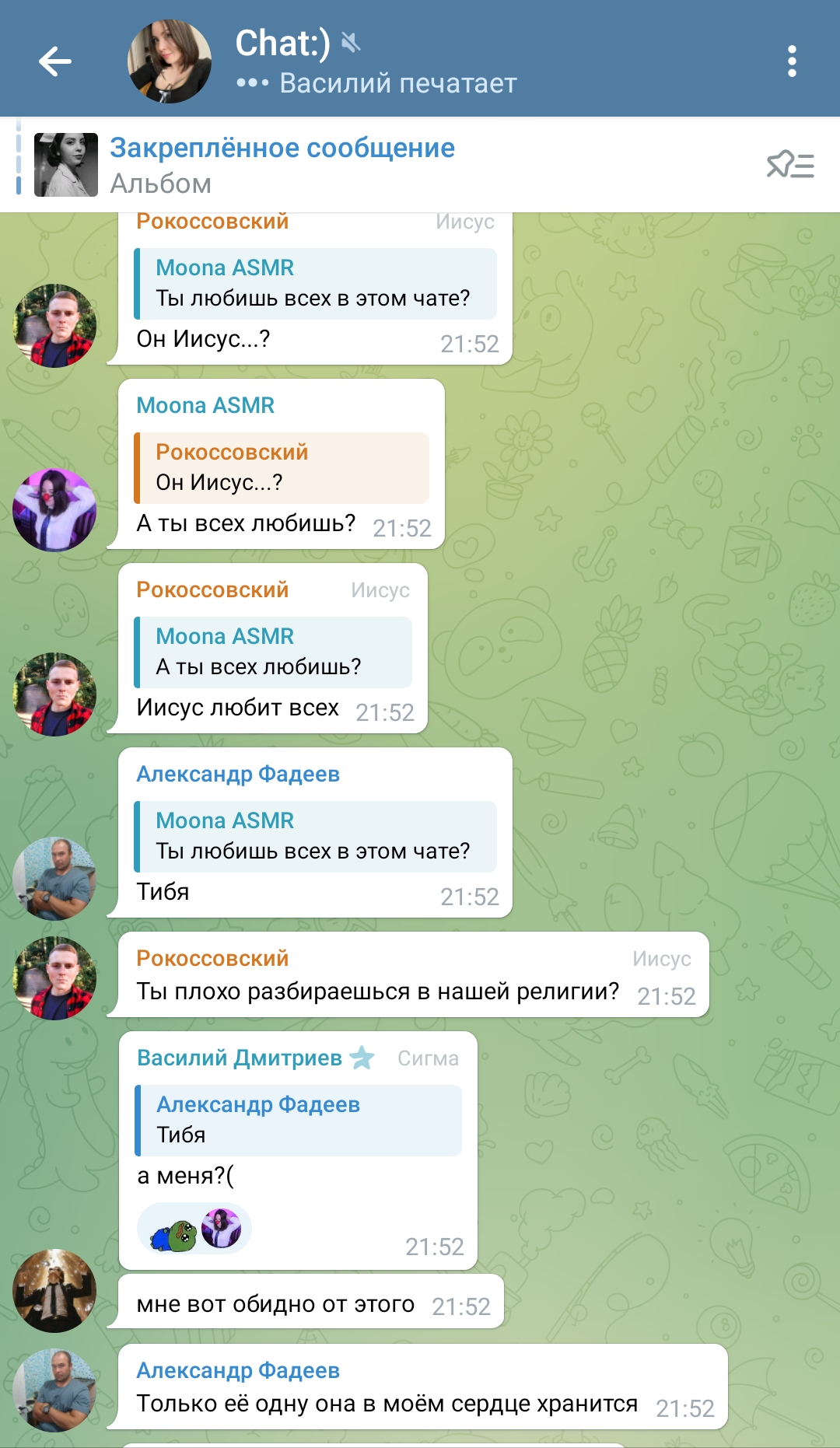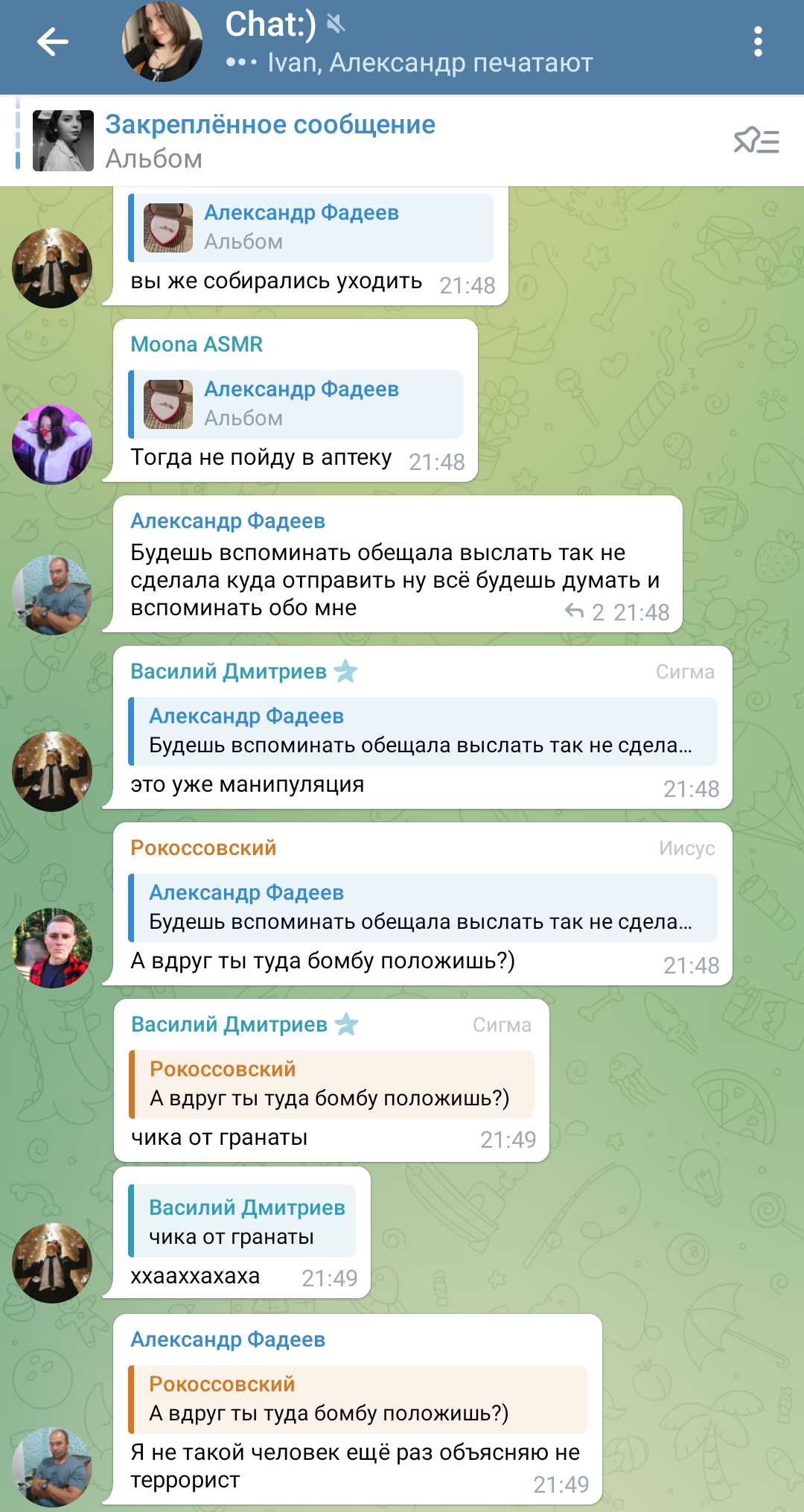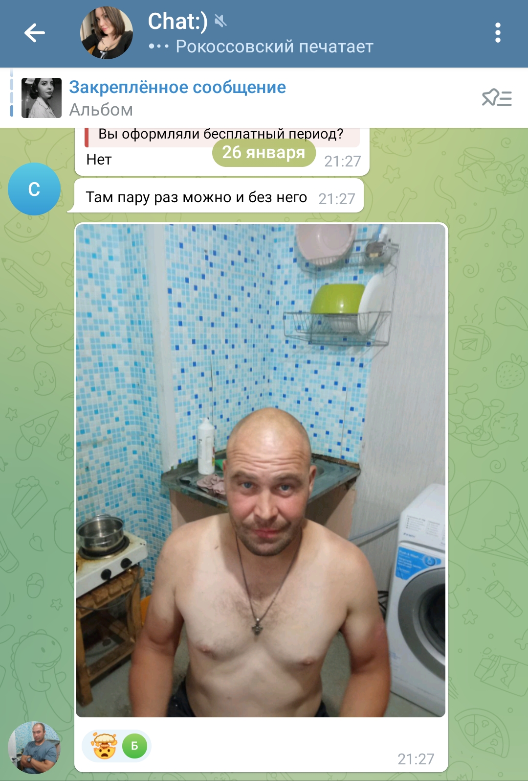 а самое главное знаете что во всём этом. что этот мужик успевает и на работу сходить и в чате у неё посидеть и она его не банит а реально ждёт кольцо ахахаха