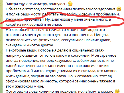 >>192109 Если ты еще жив и тебе интересно. По поводу пункта, почему одинока и нет родни, могу пояснить. Родни у нее много, она мне говорила, что ругается с ними постоянно. Она с ними общалась в вк(она свой вк удаляла снова возвращала и удаляла) они ее обвиняли, что она хайпится на смерти отца. Помирилась с ними или нет, не знаю, я с ней не общался уже несколько лет.