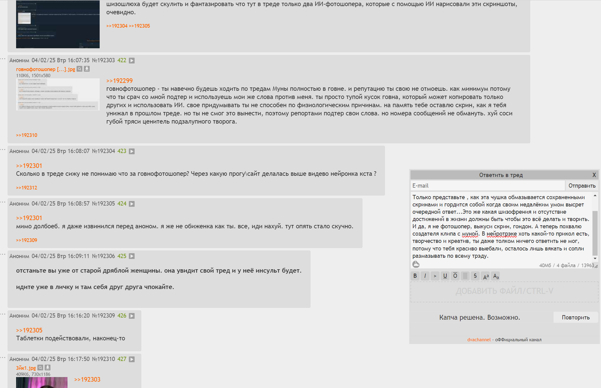 Это всё один человек писал в гостевом режиме, через VPN, через фотошоп и ИИ. Какой же смешной ты, ебрило. Я сначала решил что это школьник тупой, но тут понятно что это тупорылый, безграмотный (что по части русского языка, что по ПК-теме) полностью провалившийся в этой жизни скуфиндуй лет 30-35, который трясется из трэда в трэд.