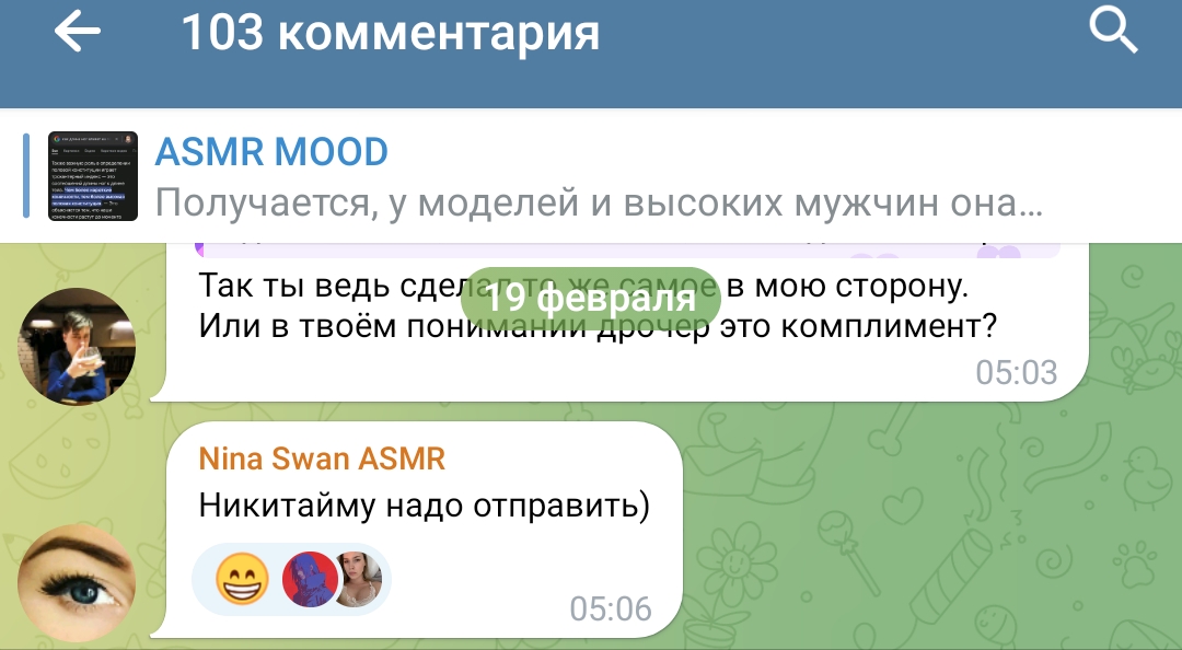 кстати, если ей написать и сиськи попросить, она наверное либо вам запишет сотню кружков почему вы не достойны её сисек либо реально скинет, в отличие от наших асмр баб.