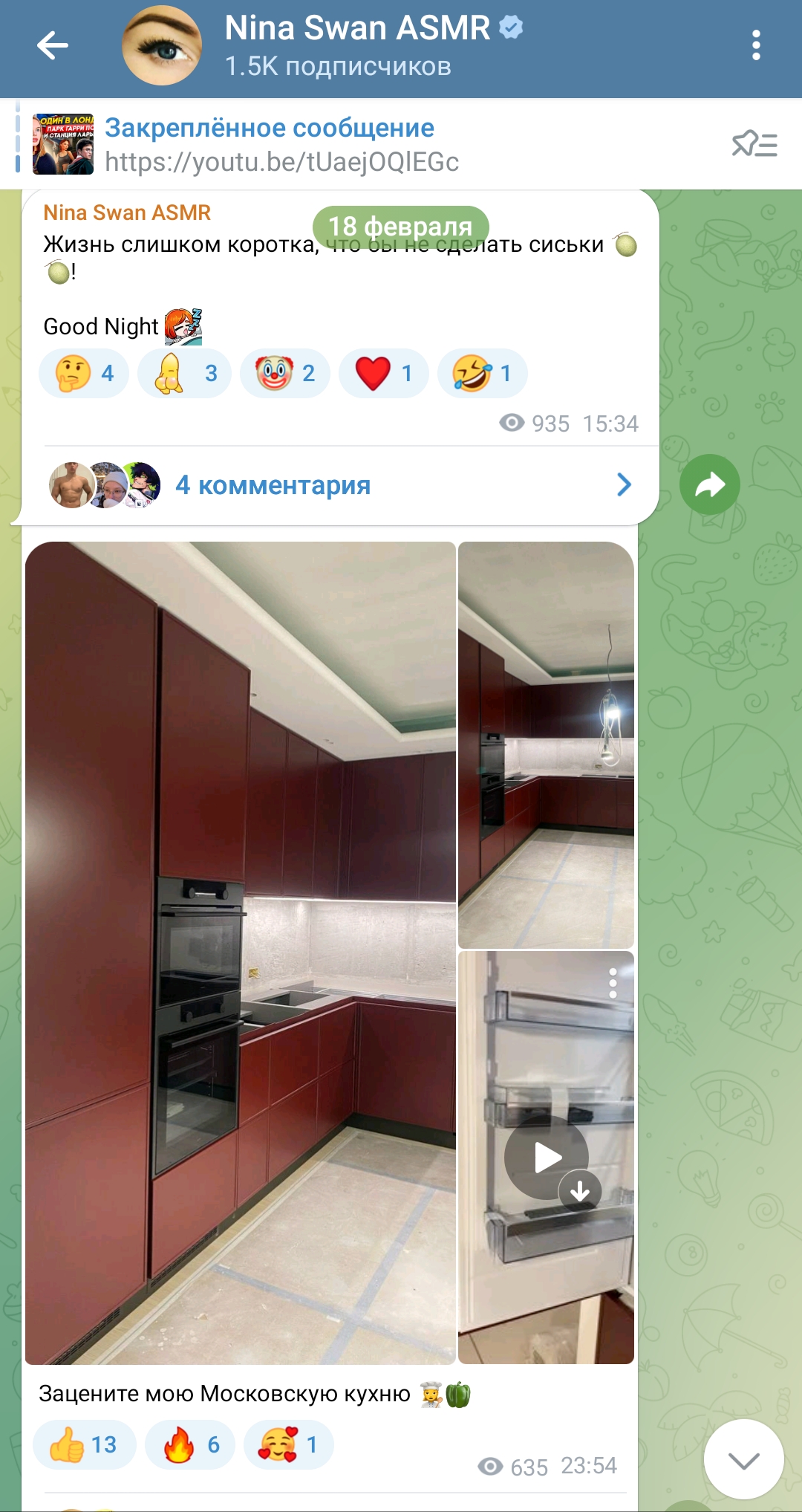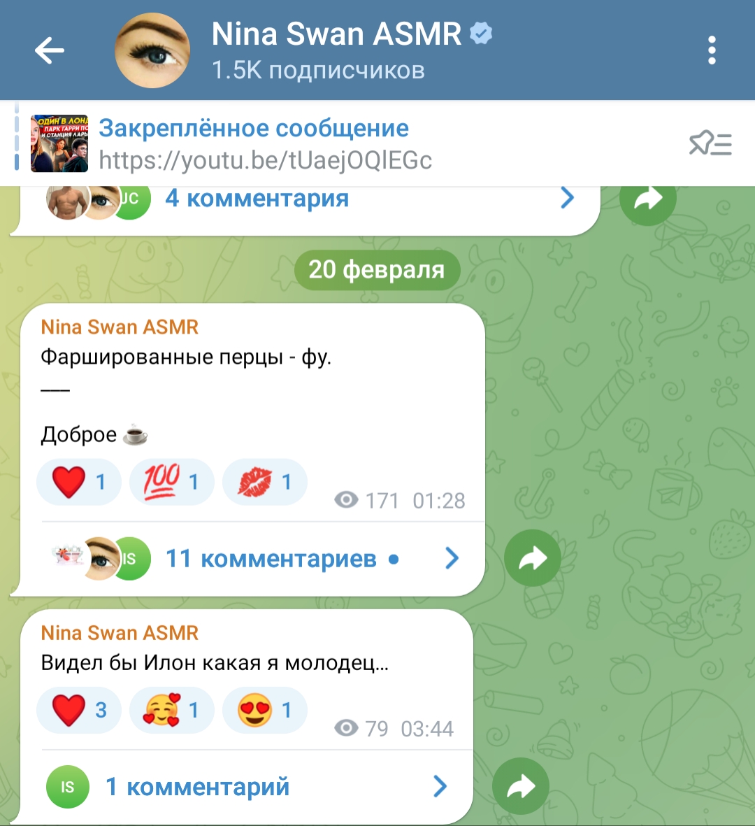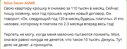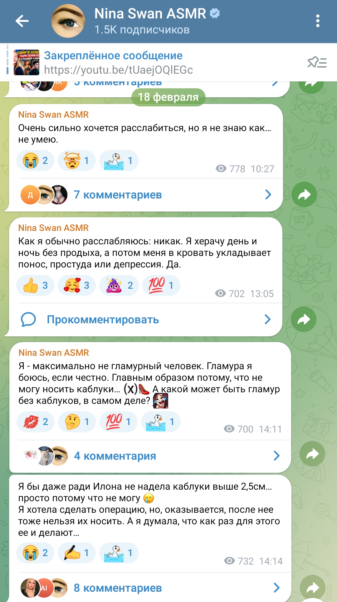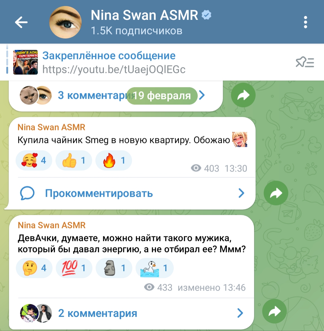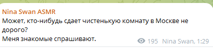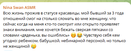 >>197710 в комментах там весь самый сок, из инцелов симпов и одруги по цену - nina swan asmr, которая похоронила всю родню и сама откинуться хочет, имеет дом в амрике, но живёт у нас ибо тут медицина дешевле, вмест того чтоб мужика найти и родить, мечтает об илоне маске и утверждает что ''много работает'' (в прошлом элитная эскортница, под видом модели насосала хуёв американских на недвигу и мерен там, но не на мозги себе)