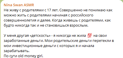 всю родню похоронила, покупает квартиры у нас в стране, сама живёт в Америке, кем работает неизвестно, сутками в телеге строчит как покакала как любит илона маска и как тратит кучу денег и что мужики не нужны.